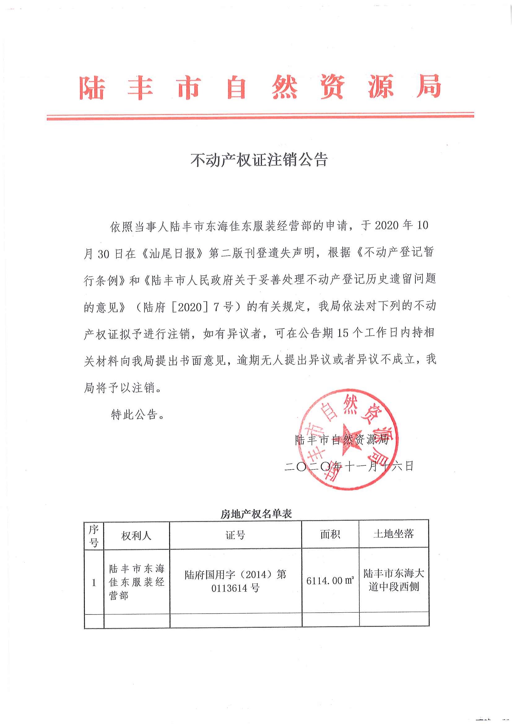 不動(dòng)產(chǎn)權(quán)證注銷(xiāo)公告(陸豐市東海佳東服裝經(jīng)營(yíng)部 )