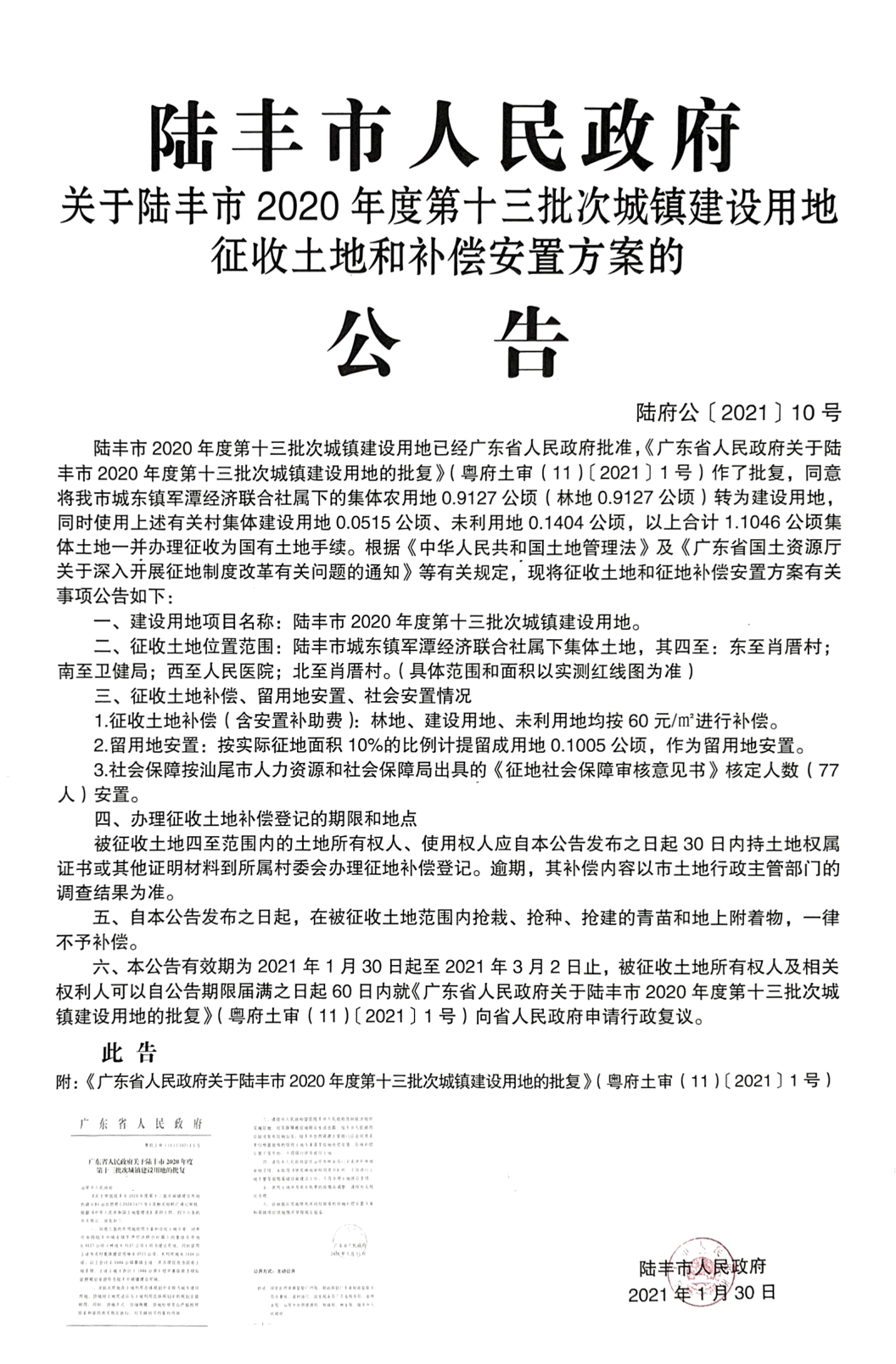 廣東省人民政府關(guān)于陸豐市2020年度第十三批次城鎮(zhèn)建設(shè)用地的批復(fù)(粵府土審(11)〔2021〕1號(hào))