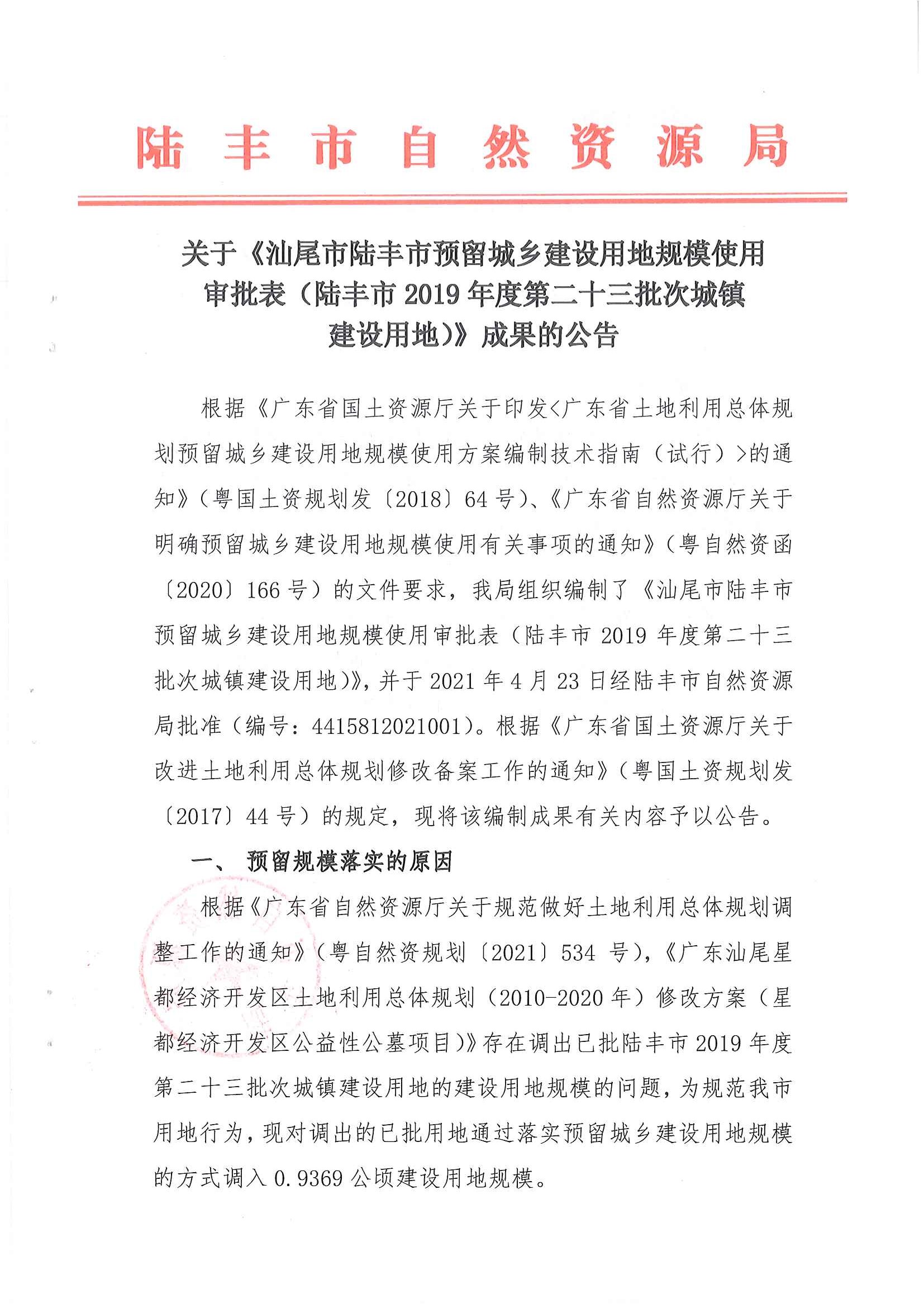 關(guān)于《汕尾市陸豐市預(yù)留城鄉(xiāng)建設(shè)用地規(guī)模使用審批表(陸豐市2019年度第二十三批次城鎮(zhèn)建設(shè)用地)》成果的公告