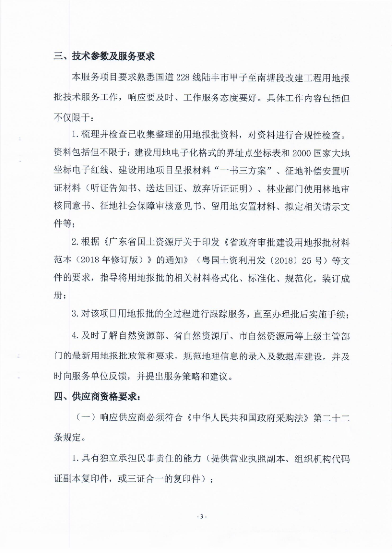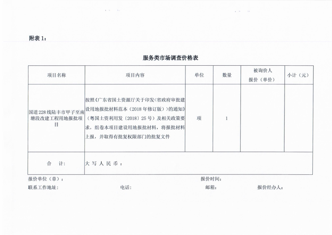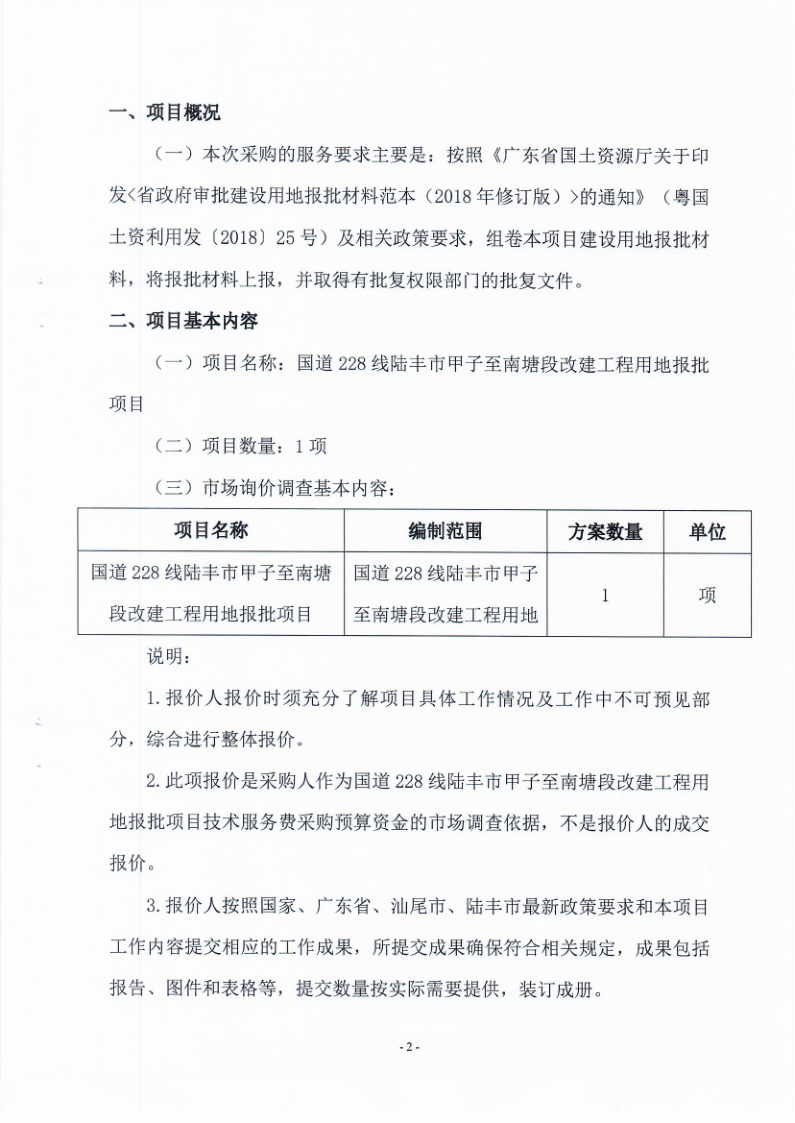 國道228線陸豐市甲子至南塘段改建工程報批服務費市場詢價調(diào)查需求書