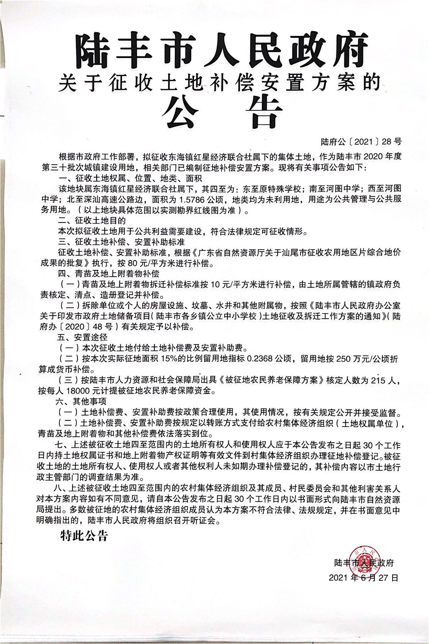 陸豐市人民政府關(guān)于征收土地補(bǔ)償安置方案的公告(陸府公[2021]28號)