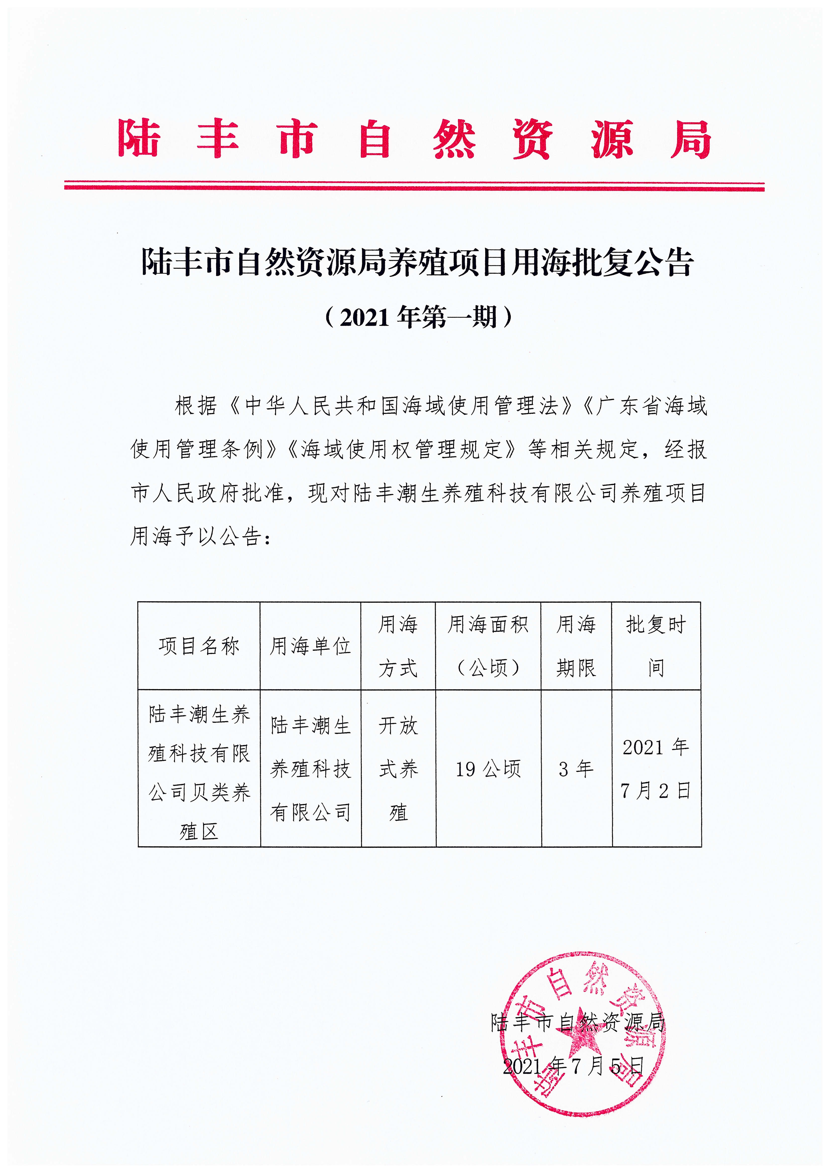 陸豐市自然資源局養(yǎng)殖項目用海批復(fù)公告(2021年第一期)