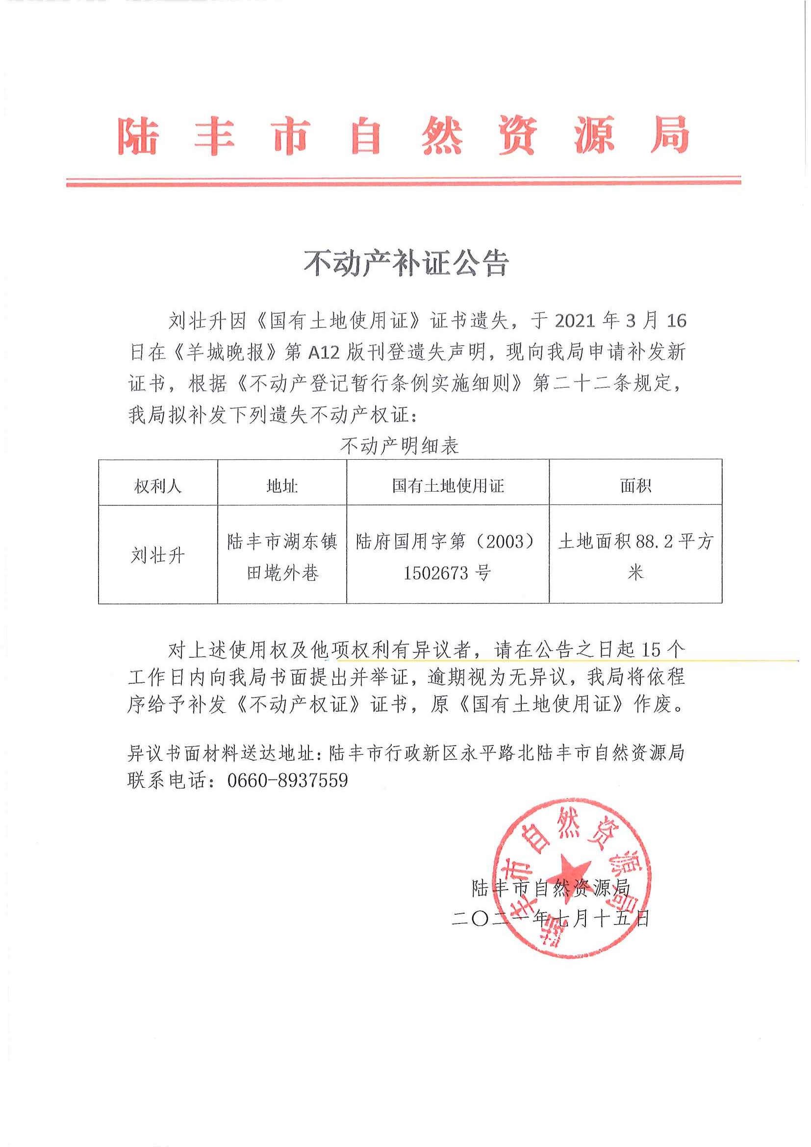 不動產(chǎn)補證公告(劉壯升)
