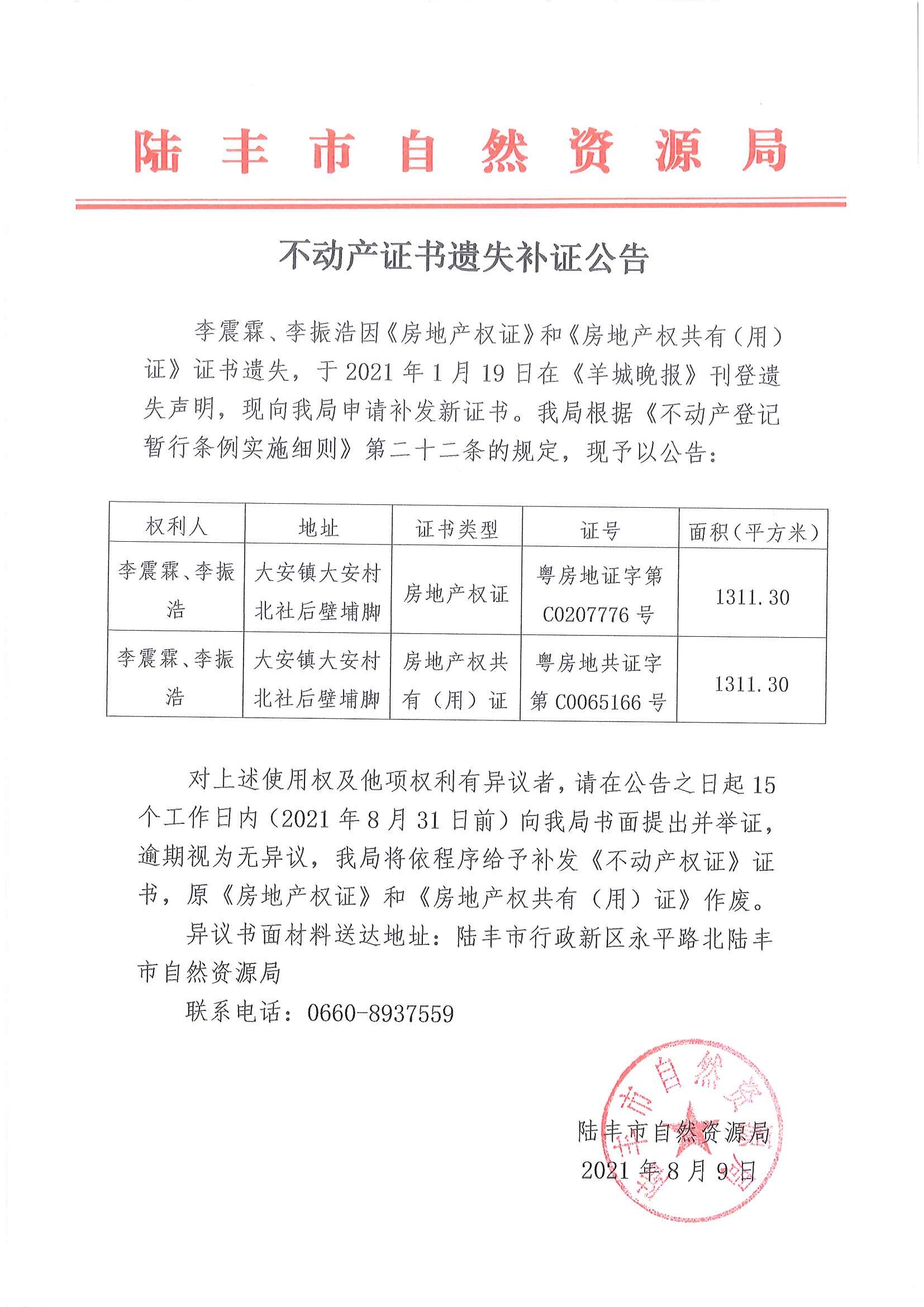 不動產(chǎn)證書遺失補證公告(李震霖、李振浩)