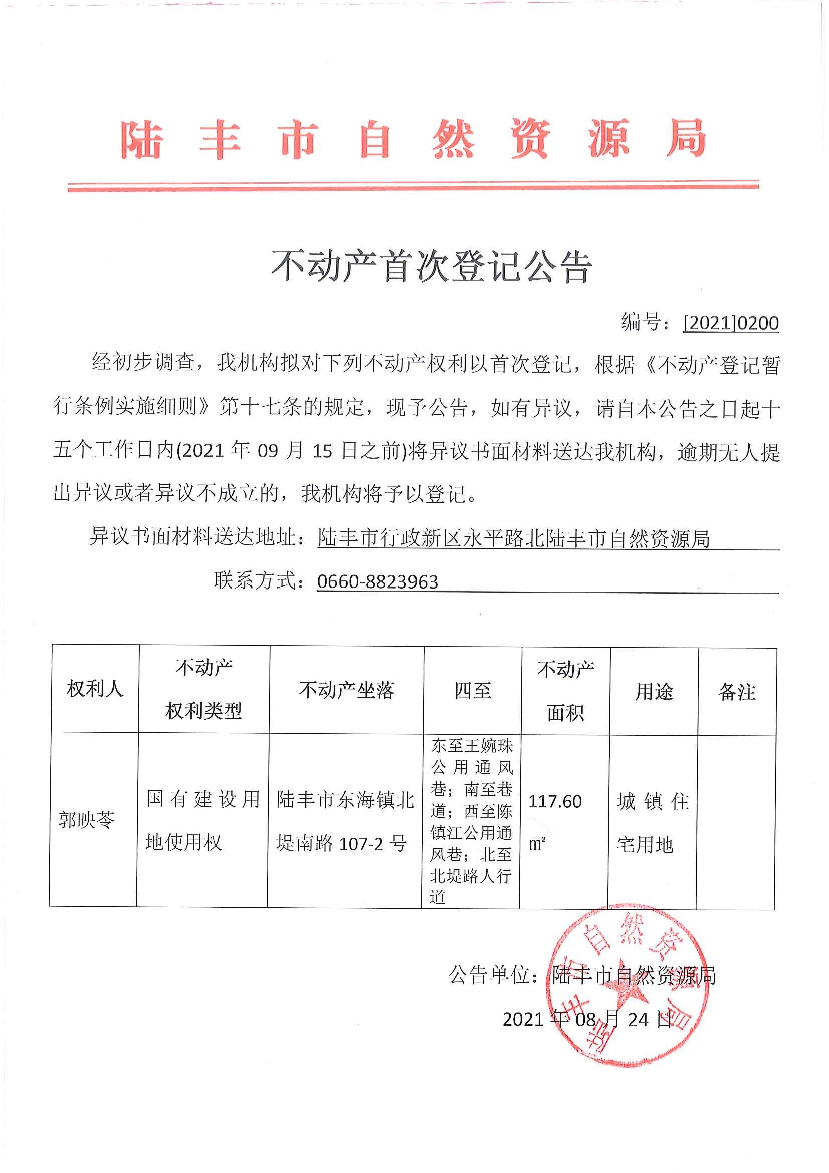 不動(dòng)產(chǎn)首次登記公告(郭映苓)