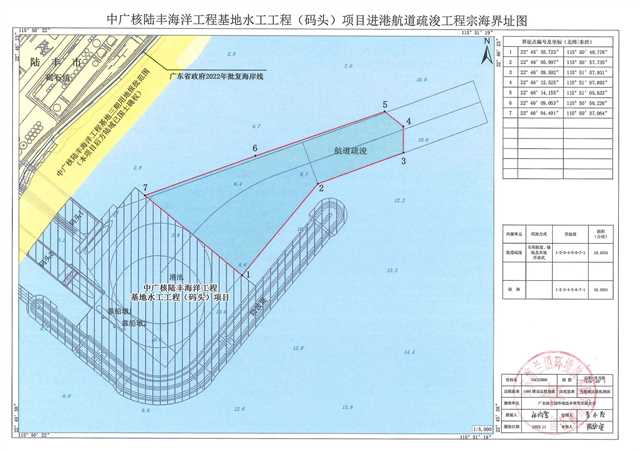 一、中廣核陸豐海洋工程基地水工工程(碼頭)項目進港航道疏浚工程在陸豐市碣石鎮(zhèn)南側(cè)附近海域中廣核陸豐海洋工程基地水工工程(碼頭)項目東北側(cè)擬申請使用海域,用海面積18.4334 公頃,用海類型為工業(yè)用海中的電力工業(yè)用海,用海方式為開放式用海中的專用航道、錨地及其它開放式用海,申請用海期限為3個月,具體界址點及坐標見附件。