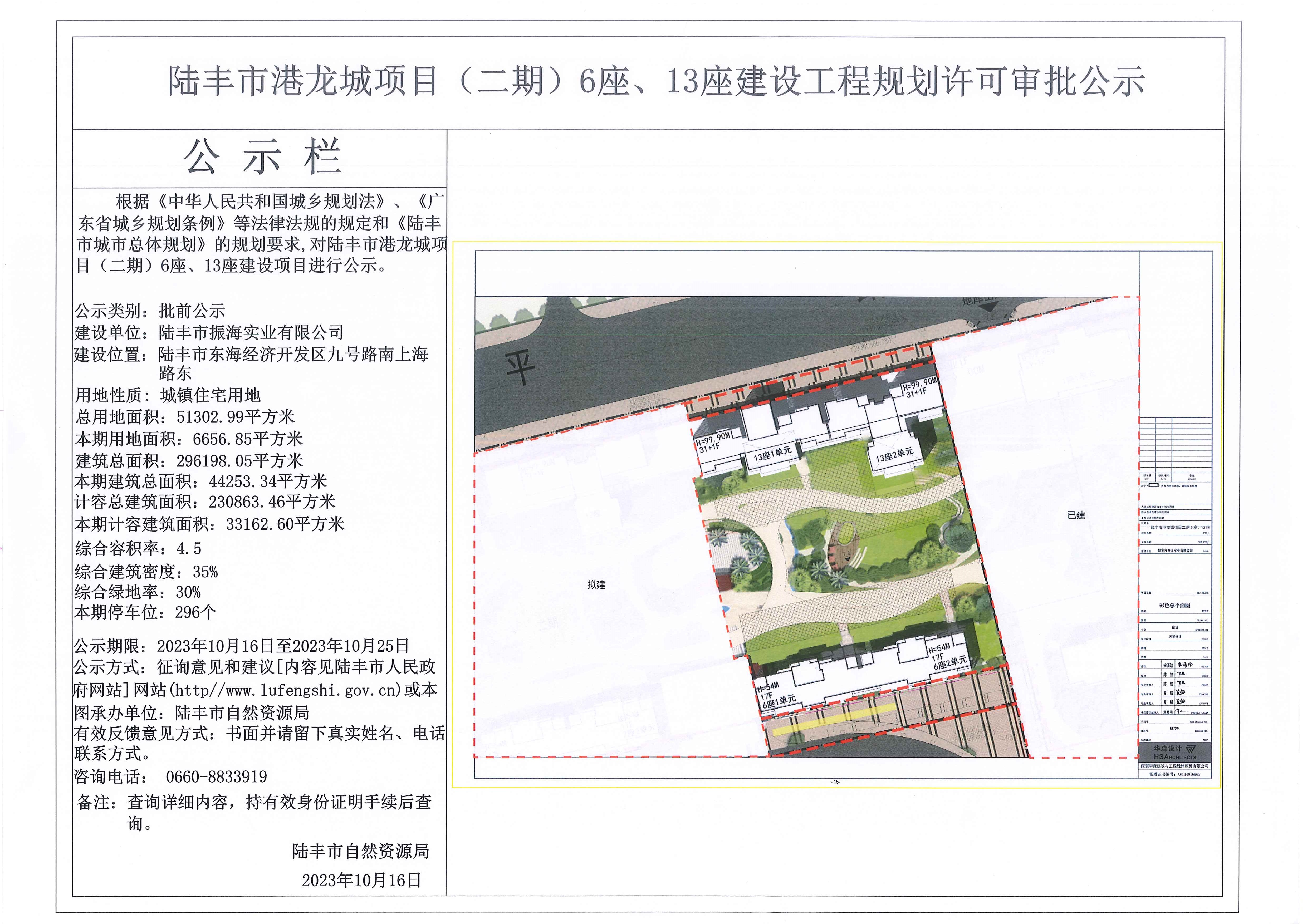 陸豐市港龍城項(xiàng)目 (二期)6座、13座建設(shè)工程規(guī)劃許可審批公示