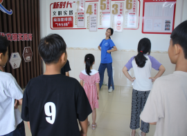 “1234、2234,握緊你的小拳頭,跟我一起動起來…”志愿者一個八拍一個八拍地進(jìn)行舞蹈教學(xué)。安靜的小學(xué)生學(xué)跳舞的時候動作也能放得開,在十五分鐘內(nèi)都學(xué)會了《嚕啦啦快樂舞》。