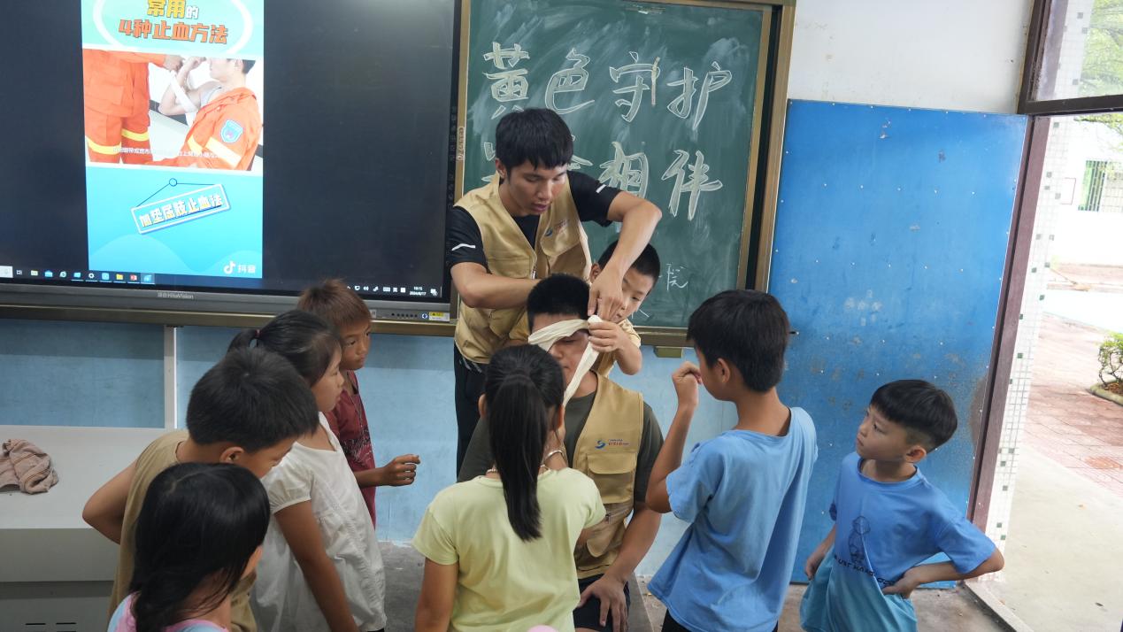 在急救知識教學環(huán)節(jié),實踐隊重點介紹了急救三角巾的使用方法。隊員們通過詳細的步驟演示,向孩子們展示了如何在緊急情況下正確使用三角巾進行包扎止血、固定受傷部位等操作。孩子們充滿好奇,紛紛圍攏過來,認真觀察學習,不少孩子還在隊員的指導下親自上手操作,掌握了這一重要的急救技能。