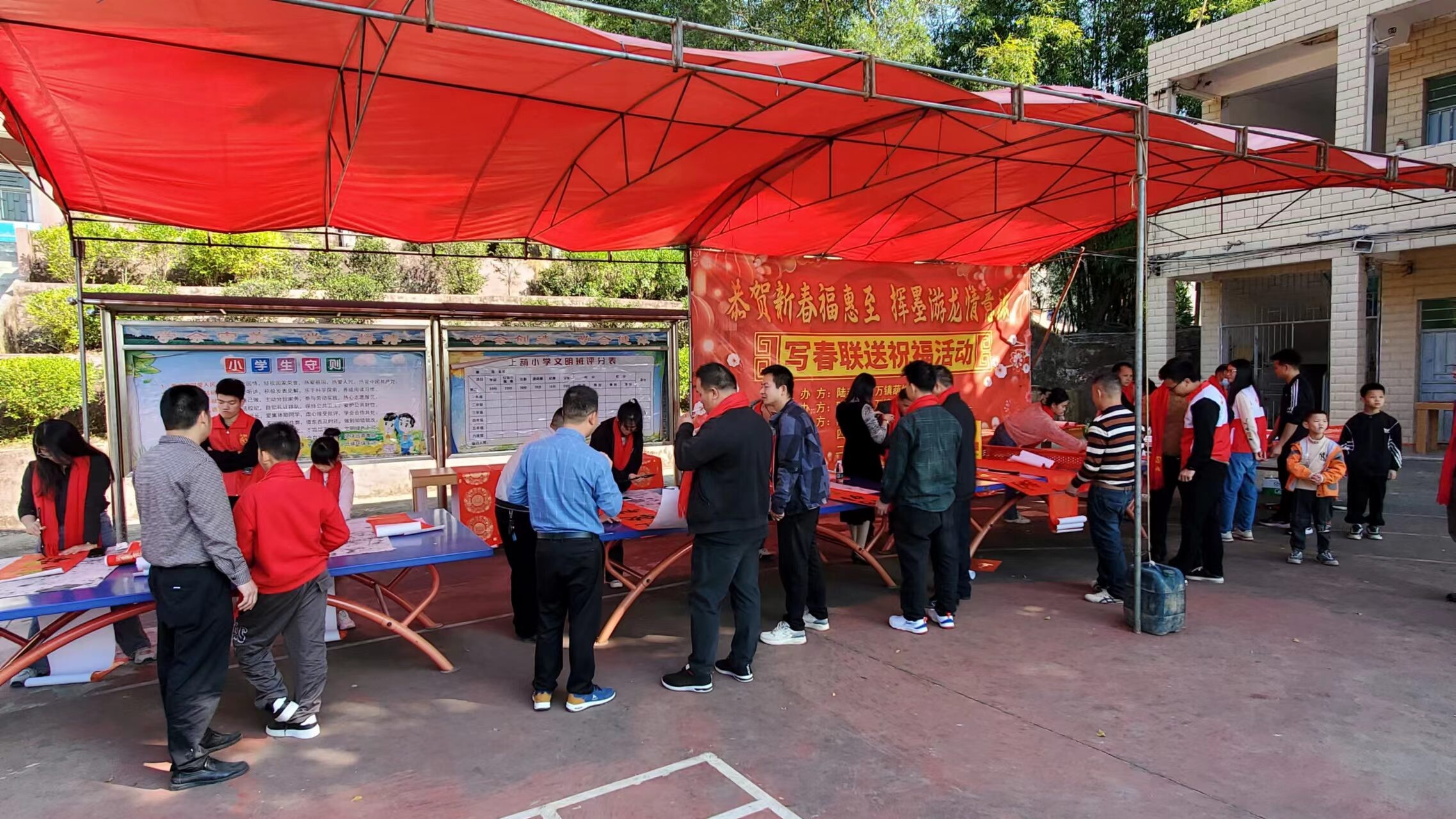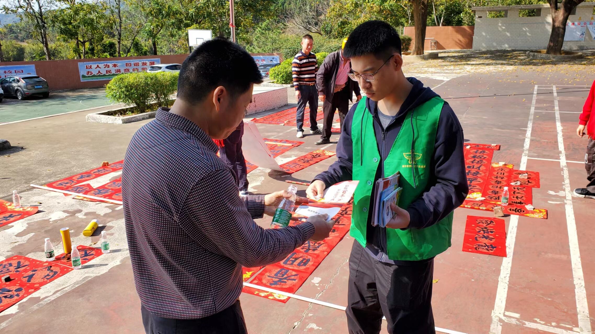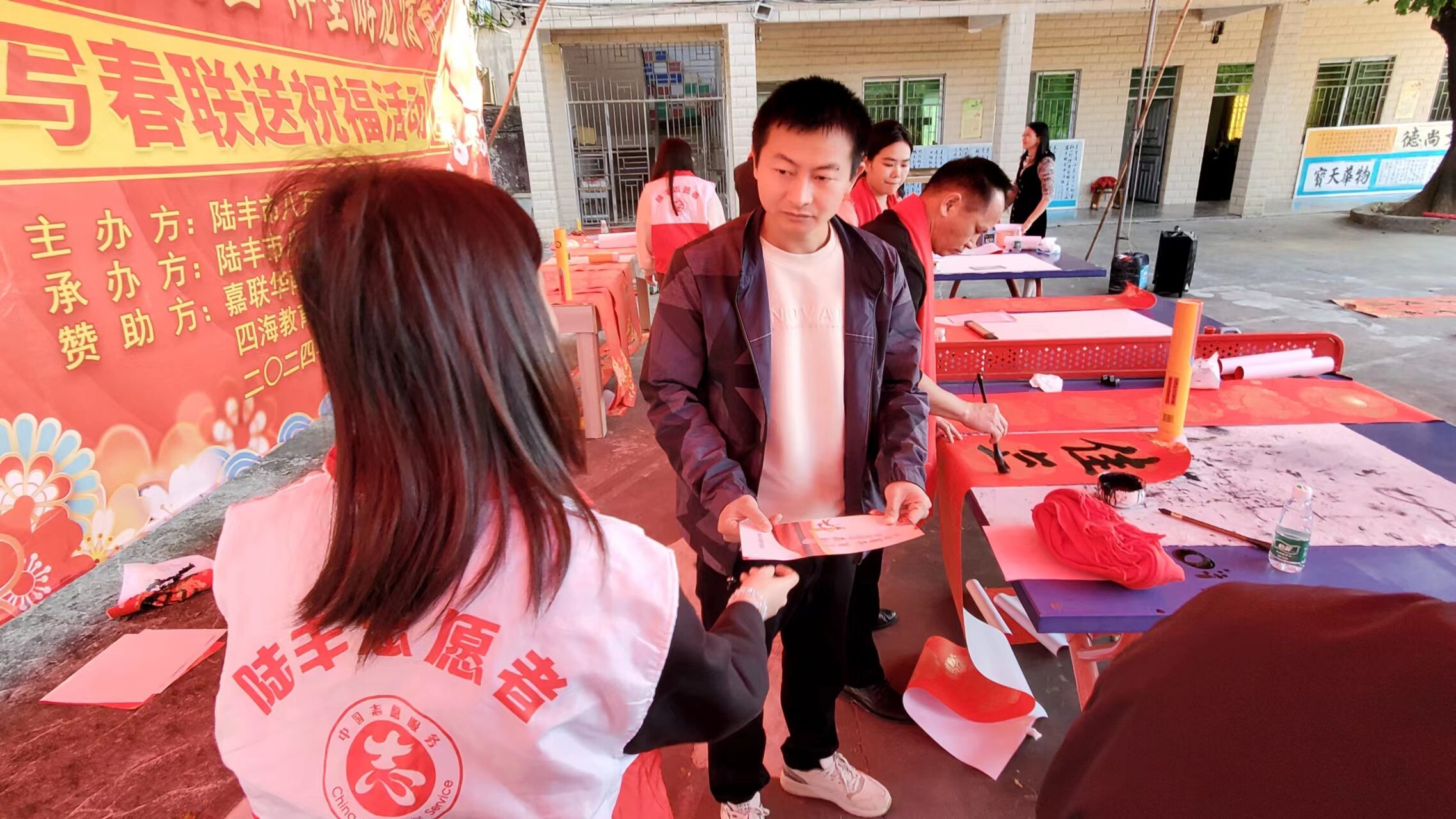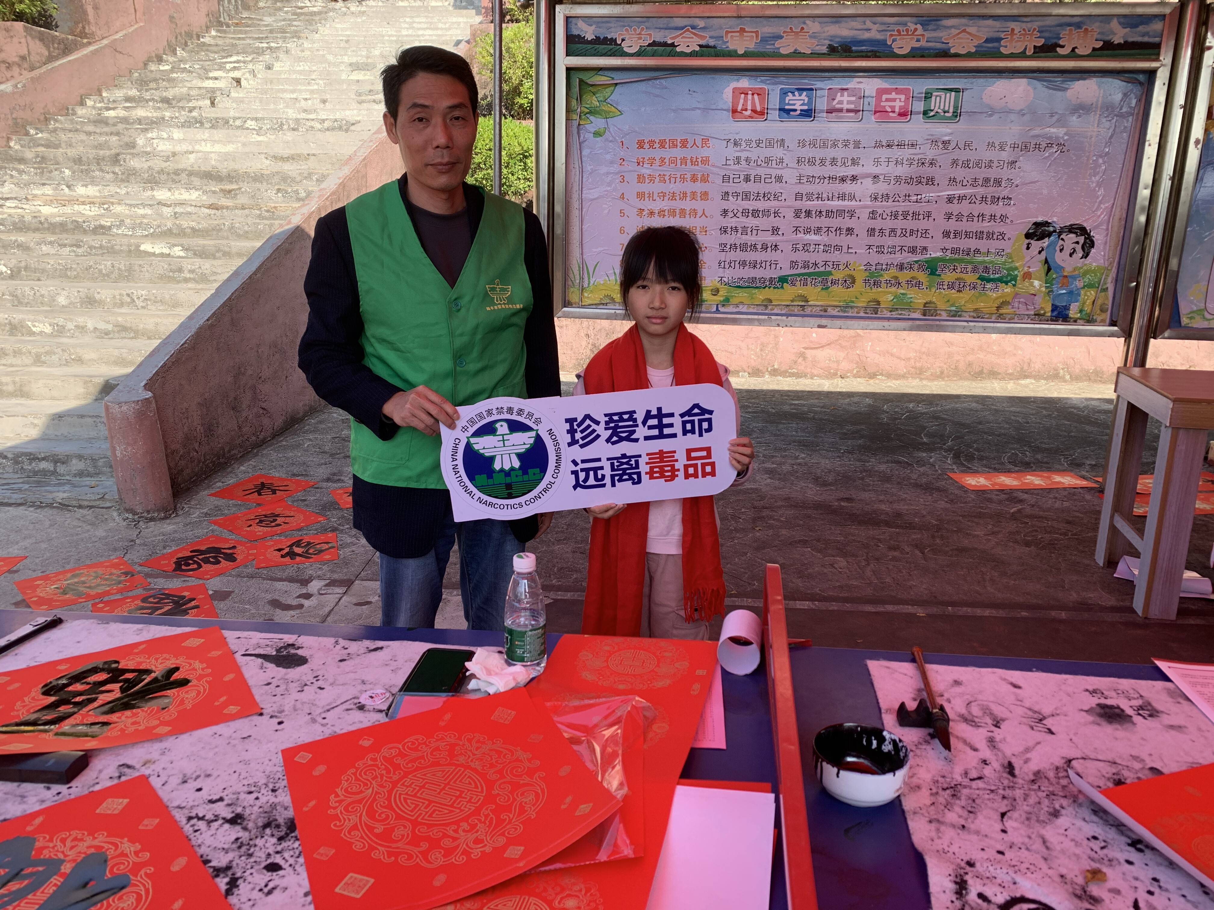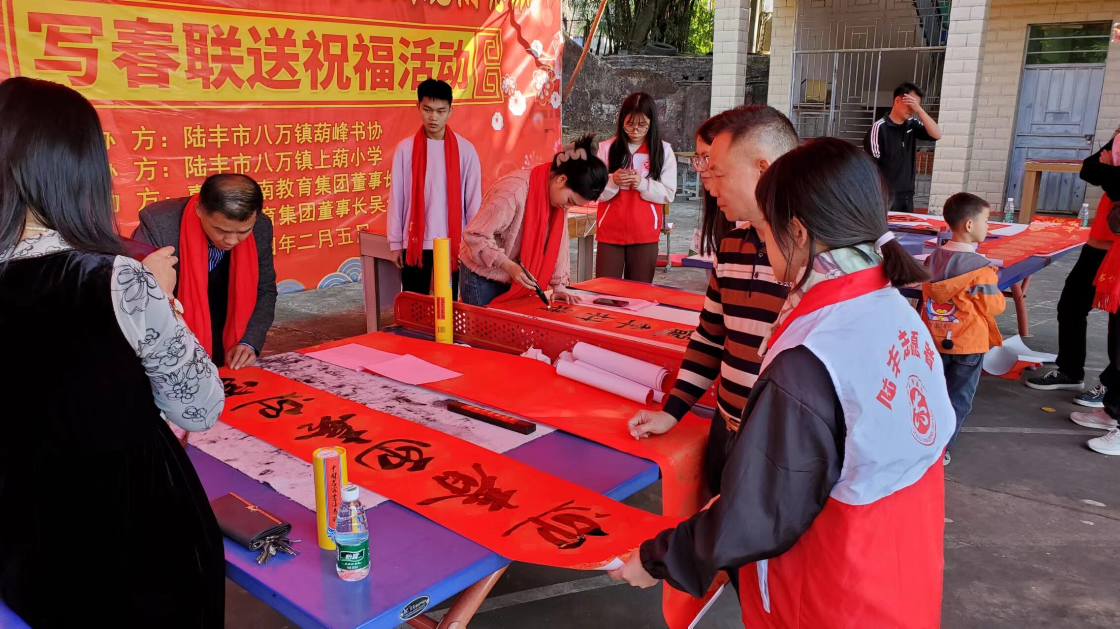 新春佳節(jié)即將來臨之際,為進一步豐富群眾的文化生活,營造全民禁毒的濃厚氛圍,抓住在外務工人員集中返鄉(xiāng)、群眾探親團聚等重要時節(jié)。2024年2月5日,八萬鎮(zhèn)沈科偉副書記、翟藝程副鎮(zhèn)長帶領鎮(zhèn)綜治辦、禁毒辦、公共服務辦、團鎮(zhèn)委、新時代文明實踐中心、應急中心、經發(fā)中心、上葫村兩委干部、禁毒志愿者聯合陸豐市八萬鎮(zhèn)葫峰書協,到上葫小學開展以“寫春聯送祝福志愿服務活動”為載體的禁毒宣傳活動。