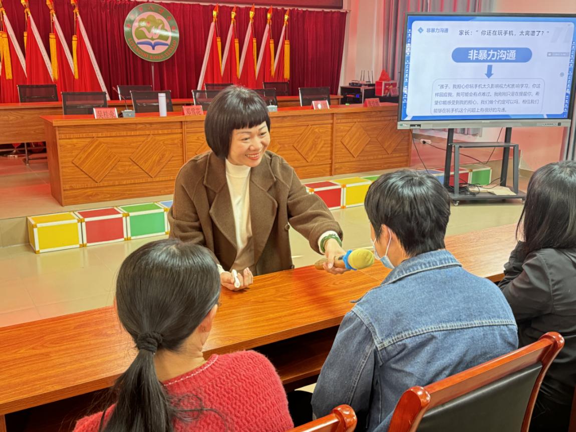 鄧雪花老師圍繞《家庭教育的著力點(diǎn)—搭建“心”的親子溝通橋》課題進(jìn)行開(kāi)講,用通俗易懂的語(yǔ)言講解親子溝通相關(guān)知識(shí),強(qiáng)調(diào)增強(qiáng)親子溝通能力對(duì)促進(jìn)家庭幸福感的重要性,多方面闡述家庭教育中阻礙親子關(guān)系的根源,并通過(guò)具體實(shí)例指導(dǎo)家長(zhǎng)從觀察(看見(jiàn)的事實(shí))、感受(體會(huì)和表達(dá))、需要(探索情緒背后的需要)、請(qǐng)求(請(qǐng)求要具體)四步來(lái)實(shí)現(xiàn)非暴力溝通,努力建立起良好、順暢的親子溝通模式,讓在場(chǎng)觀眾受益匪淺,博得了家長(zhǎng)們熱烈的掌聲與會(huì)心的笑聲。