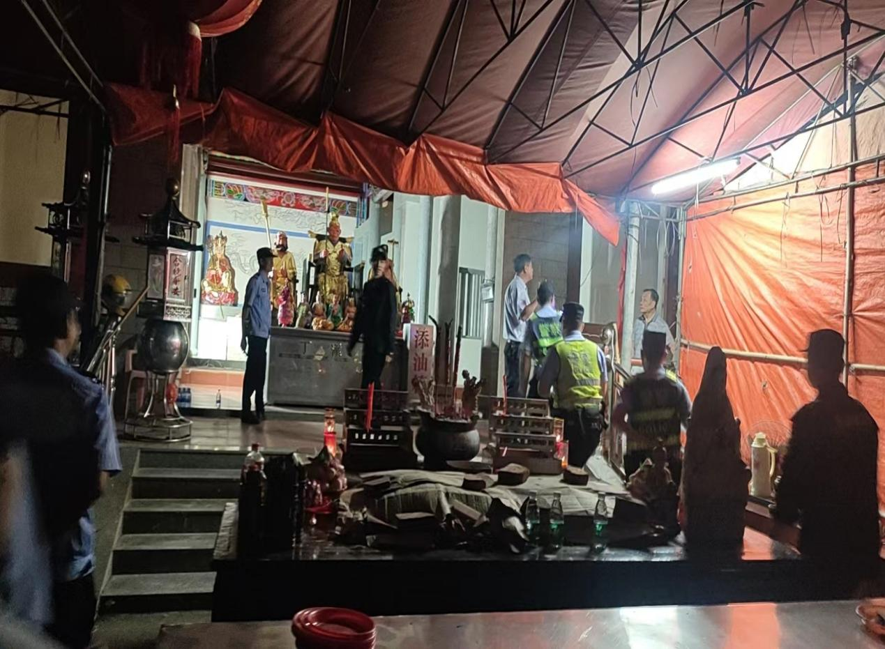 此次行動出動人數(shù)80余人,分為兩組,一組由黨工委副書記周業(yè)齊帶隊(duì)領(lǐng)導(dǎo)前往山腳村寺廟及其周邊內(nèi)開展清理清查;二組由派出所民警帶隊(duì)領(lǐng)導(dǎo)前往蓮花古寺及其周邊開展清理清查。