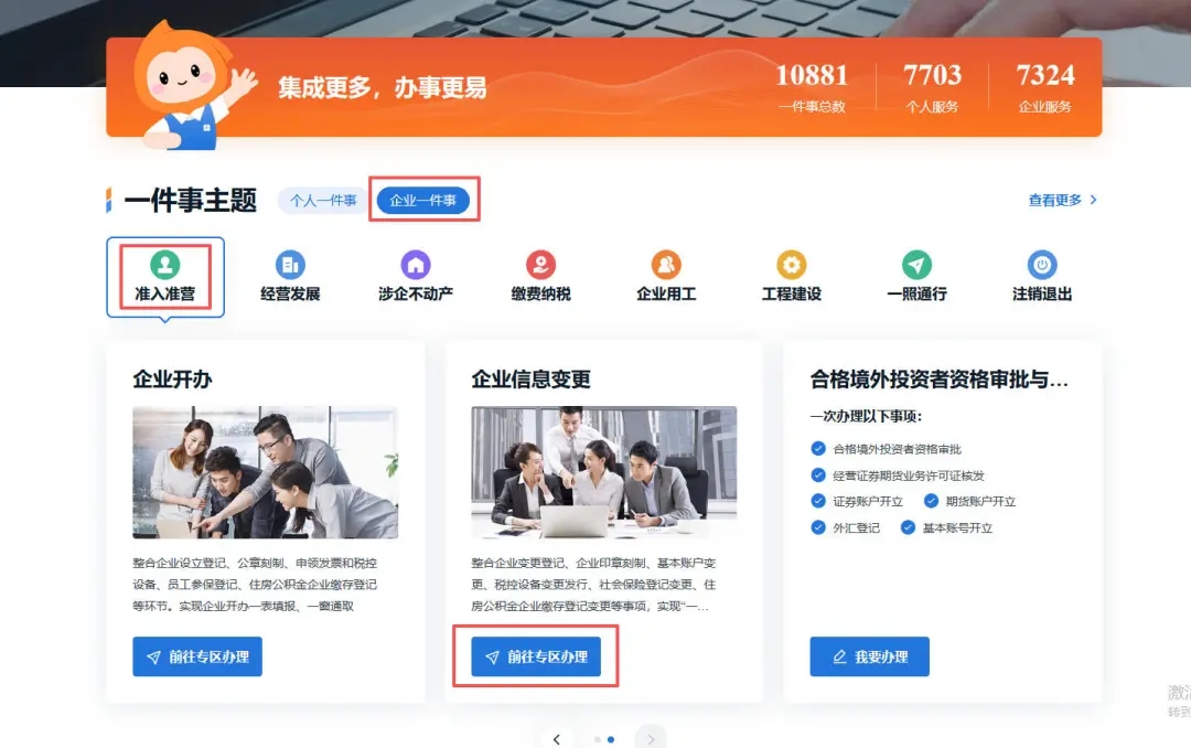點(diǎn)擊“企業(yè)一件事”—“準(zhǔn)入準(zhǔn)營(yíng)”—“企業(yè)信息變更”—“前往專區(qū)辦理”