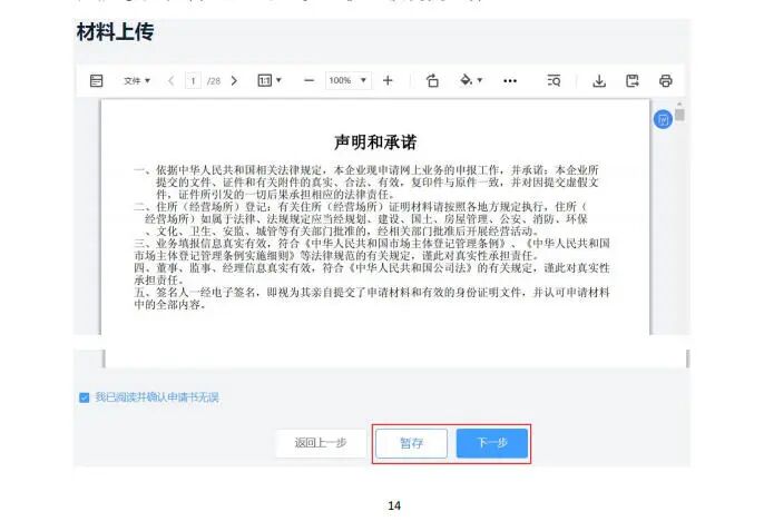 上傳附件材料后點(diǎn)擊下一步,進(jìn)入到文書確認(rèn)預(yù)覽界面。確認(rèn)信息后即可點(diǎn)擊“下一步”按鈕預(yù)提交業(yè)務(wù)即可。