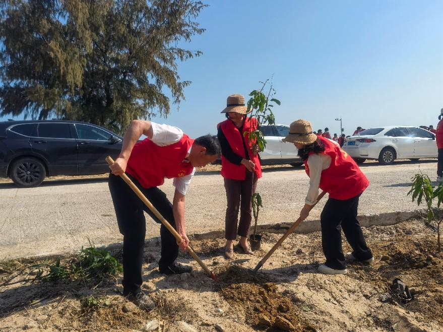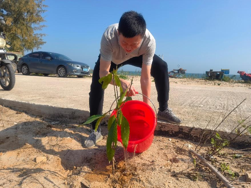活動(dòng)現(xiàn)場(chǎng),大家分工合作,有條不紊地進(jìn)行著樹(shù)苗拆袋、扶苗培土、澆水等工作。經(jīng)過(guò)一下午的辛勤努力,300 棵芒果樹(shù)苗在大家的悉心栽植下,整齊地排列在洲渚村草寮村的土地上,迎風(fēng)挺立,在明媚的春光中煥發(fā)出勃勃生機(jī)。這些樹(shù)苗不僅為金廂鎮(zhèn)增添了一抹新綠,更承載著大家對(duì)綠色未來(lái)的美好期許。