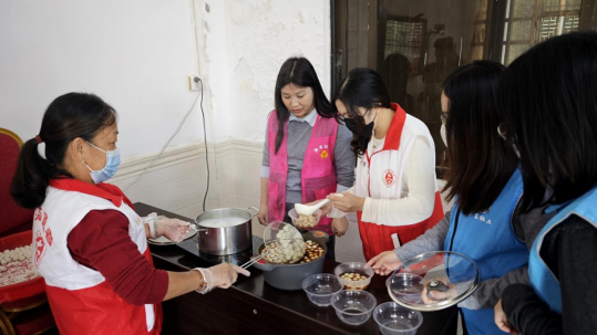 活動現(xiàn)場,鎮(zhèn)、村志愿者分工協(xié)作,揉面團、調(diào)餡料、包菜包粿、搓湯圓,動作嫻熟又充滿笑意。不一會兒,一個個飽滿的菜包粿、圓滾滾的湯圓便擺滿了盆碟;經(jīng)過蒸煮,香氣四溢的美食被細心分裝成一份份愛心餐盒。