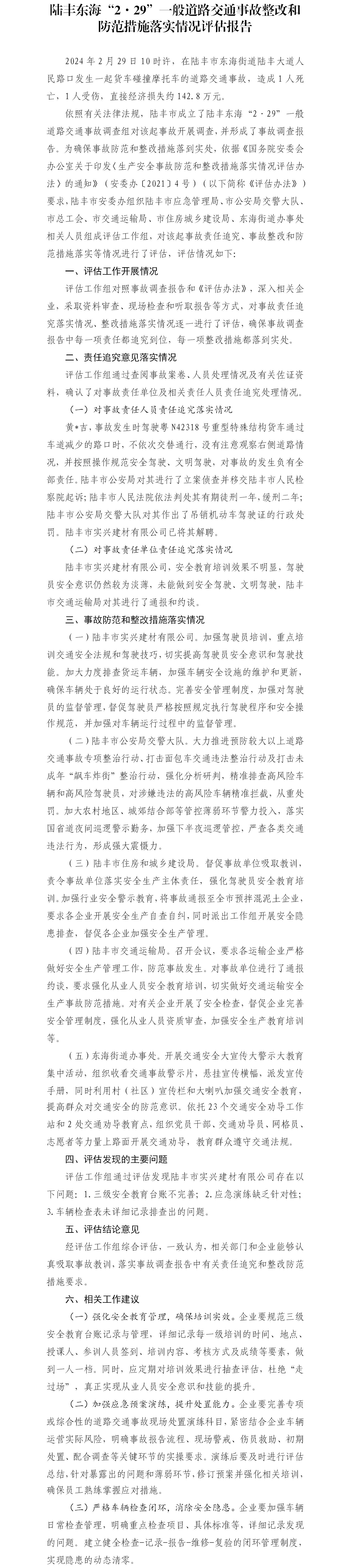 陸豐東?!?·29”一般道路交通事故整改和防范措施落實(shí)情況評(píng)估報(bào)告