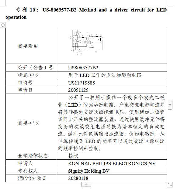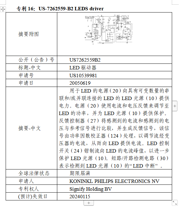 涉案專(zhuān)利共20件,涉及LED驅(qū)動(dòng)電路、光學(xué)元件、系統(tǒng)架構(gòu)等,專(zhuān)利信息詳見(jiàn)下表。值得注意的是,在20件涉案專(zhuān)利中,有7件專(zhuān)利在Signify和Current的訴訟中均有涉及,11件專(zhuān)利由Current提起不侵權(quán)宣告而并未被Signify作為專(zhuān)利侵權(quán)訴訟基礎(chǔ),2件專(zhuān)利Signify作為專(zhuān)利侵權(quán)訴訟基礎(chǔ)但Current未提起不侵權(quán)宣告。