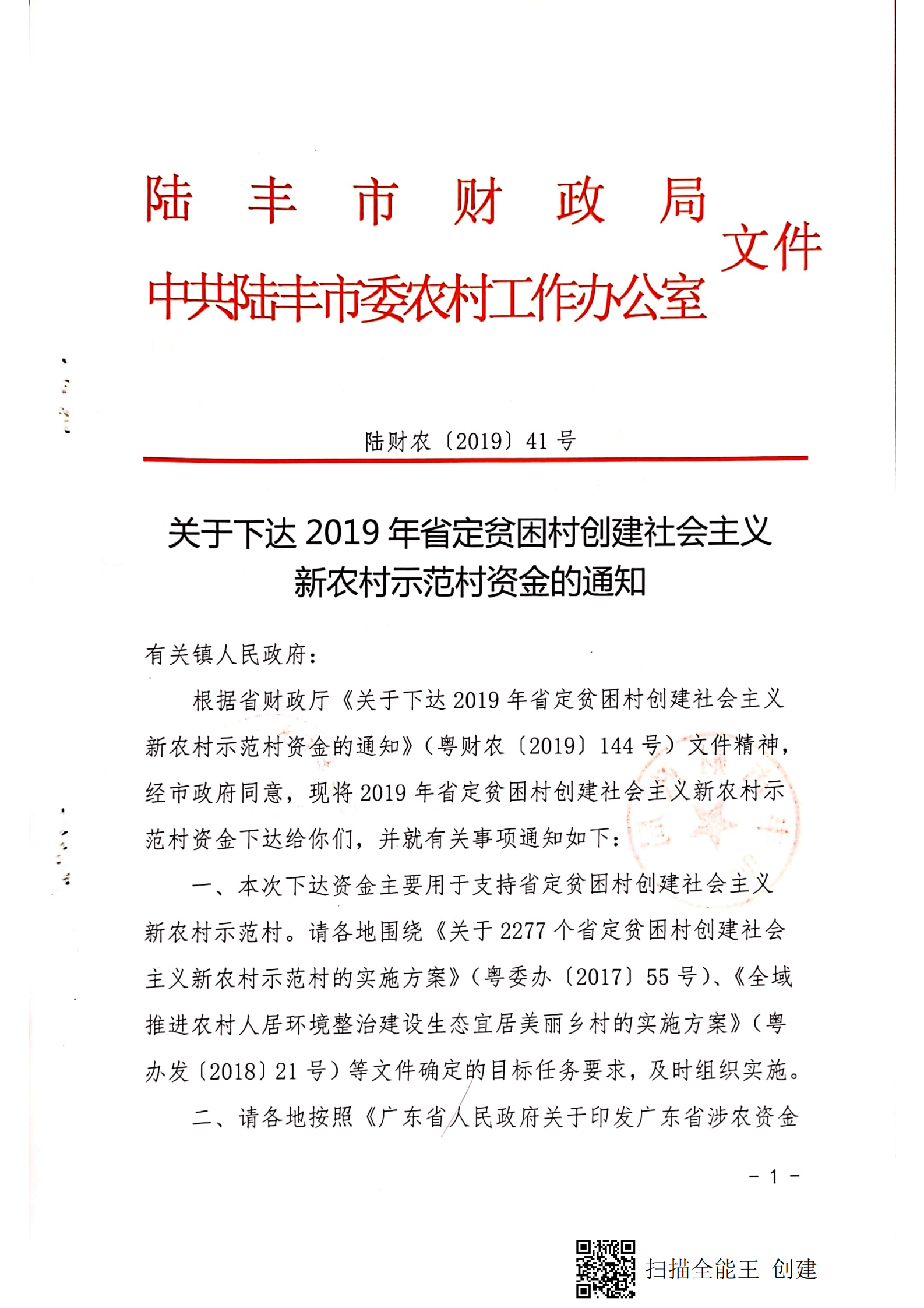 關(guān)于下達(dá)2019年省定貧困村創(chuàng)建社會主義新農(nóng)村示范村資金的通知