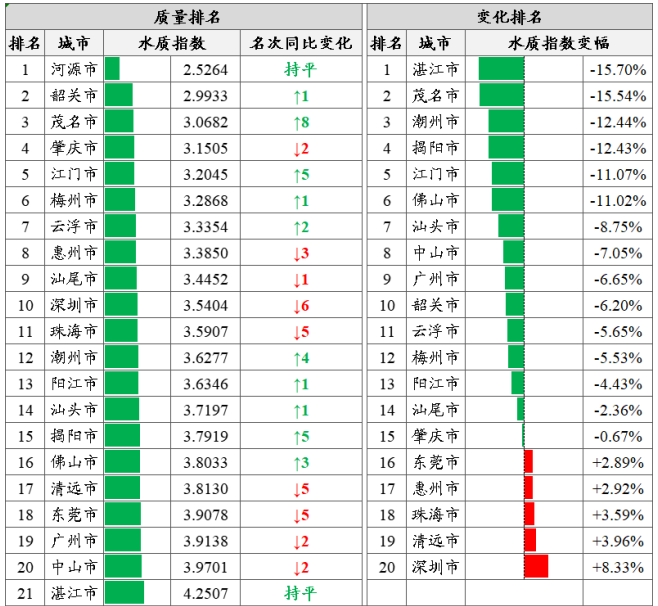 城市排名:基于270個(gè)省考斷面水質(zhì)監(jiān)測(cè)結(jié)果,按照城市水質(zhì)指數(shù)由低到高排名,全省水環(huán)境質(zhì)量前三名為河源、韶關(guān)和茂名市,后三名由高到低為湛江、中山和廣州市。湛江、茂名和潮州等15市水環(huán)境質(zhì)量同比有所改善,深圳、清遠(yuǎn)和珠海等5市同比有所下降(河源市所有省考斷面均達(dá)到水質(zhì)目標(biāo)且均達(dá)到或優(yōu)于Ⅱ類,不參與水質(zhì)變化排名)。