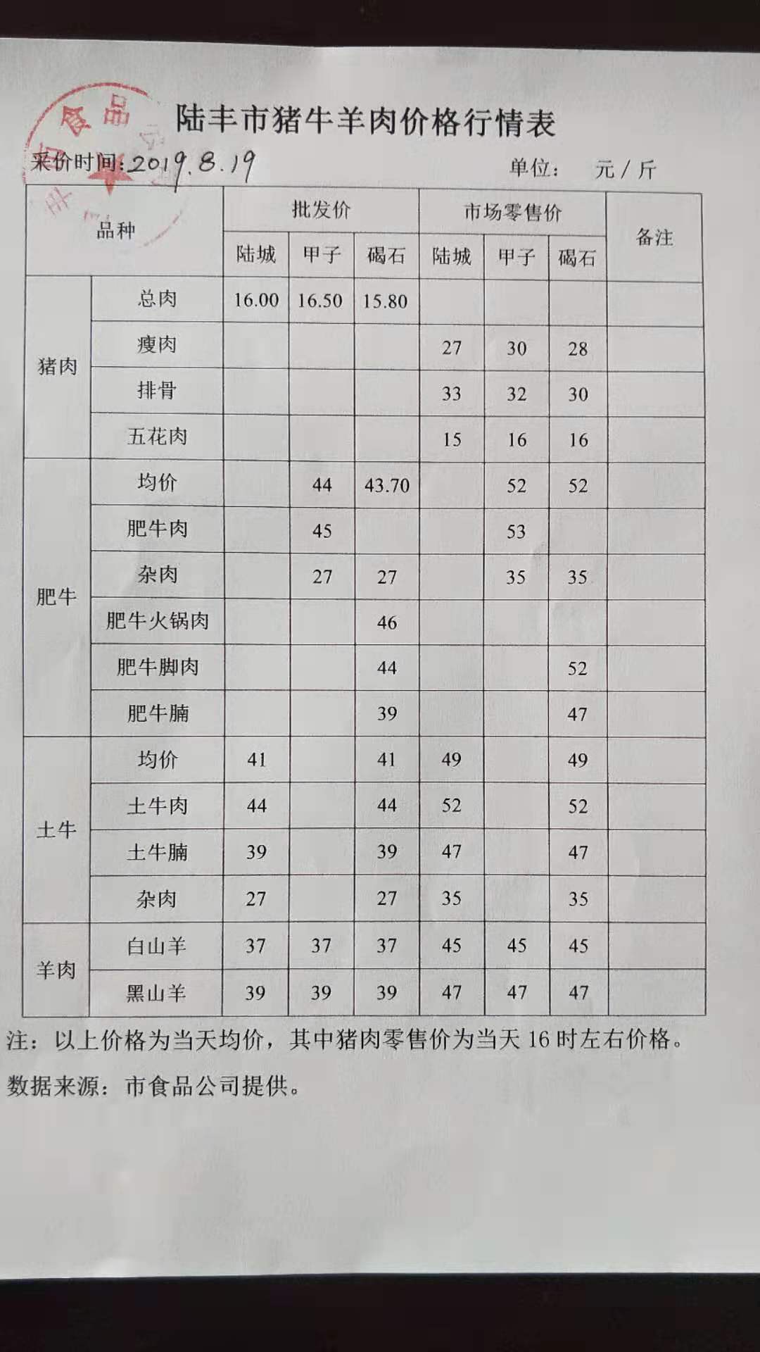 陸豐市豬牛羊肉價(jià)格行情表(2019年8月19日)