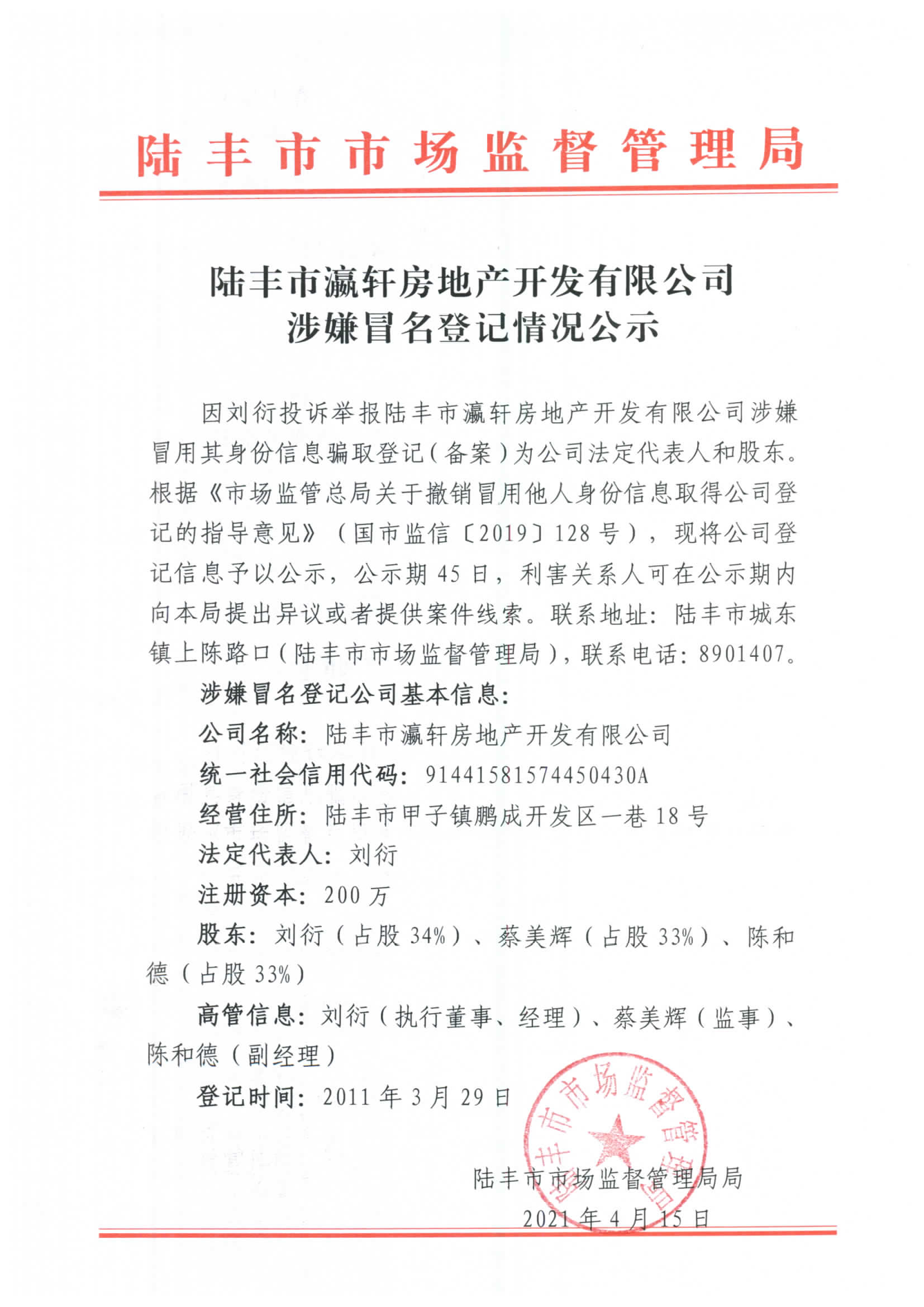 陸豐市瀛軒房地產(chǎn)開發(fā)有限公司涉嫌冒名登記情況公示