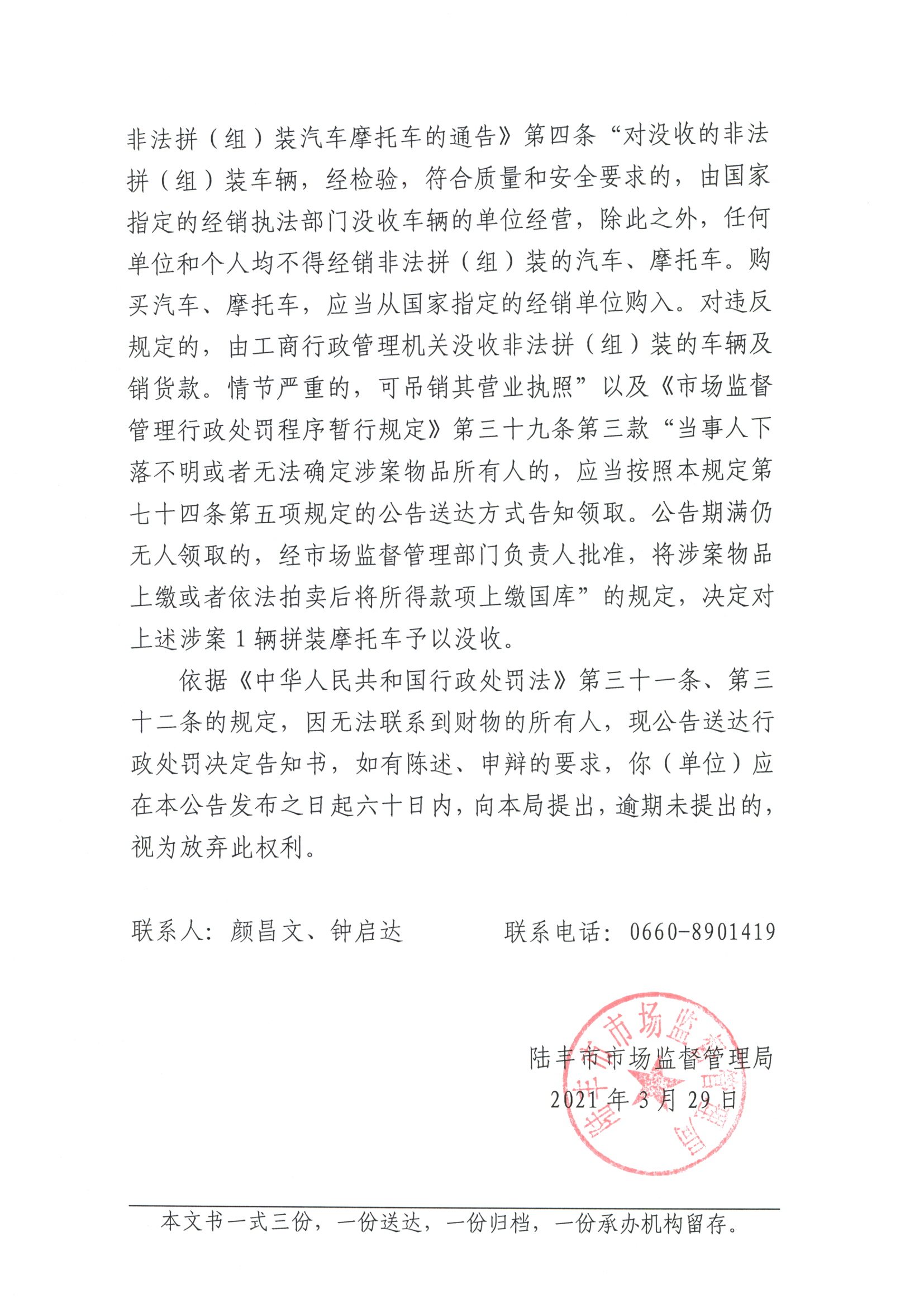 陸豐市市場監(jiān)督管理局無人認領財物行政處罰決定告知公告