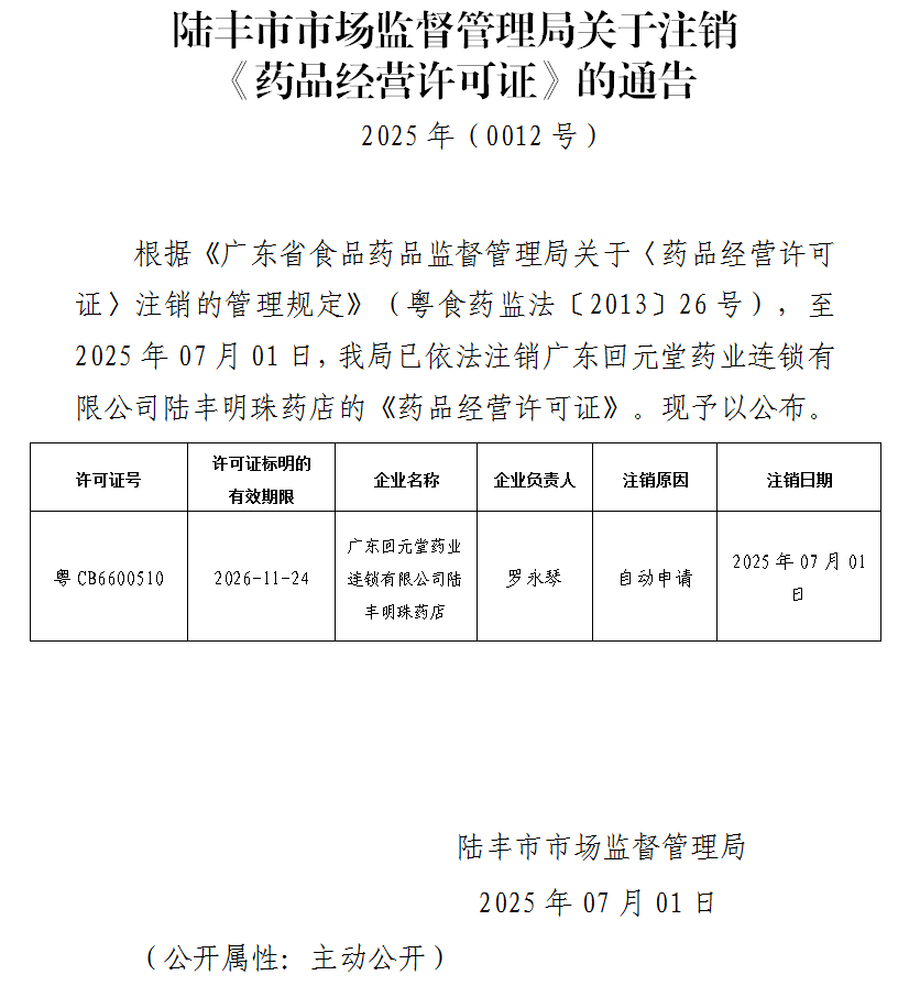 陸豐市市場監(jiān)督管理局關(guān)于注銷《藥品經(jīng)營許可證》的通告