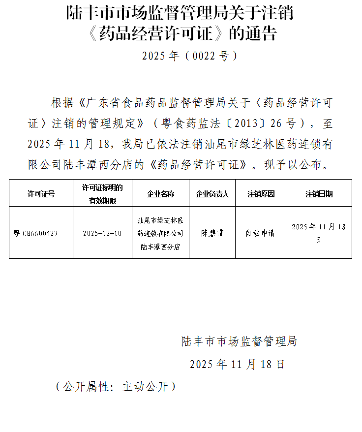 陸豐市市場監(jiān)督管理局關(guān)于注銷《藥品經(jīng)營許可證》的通告