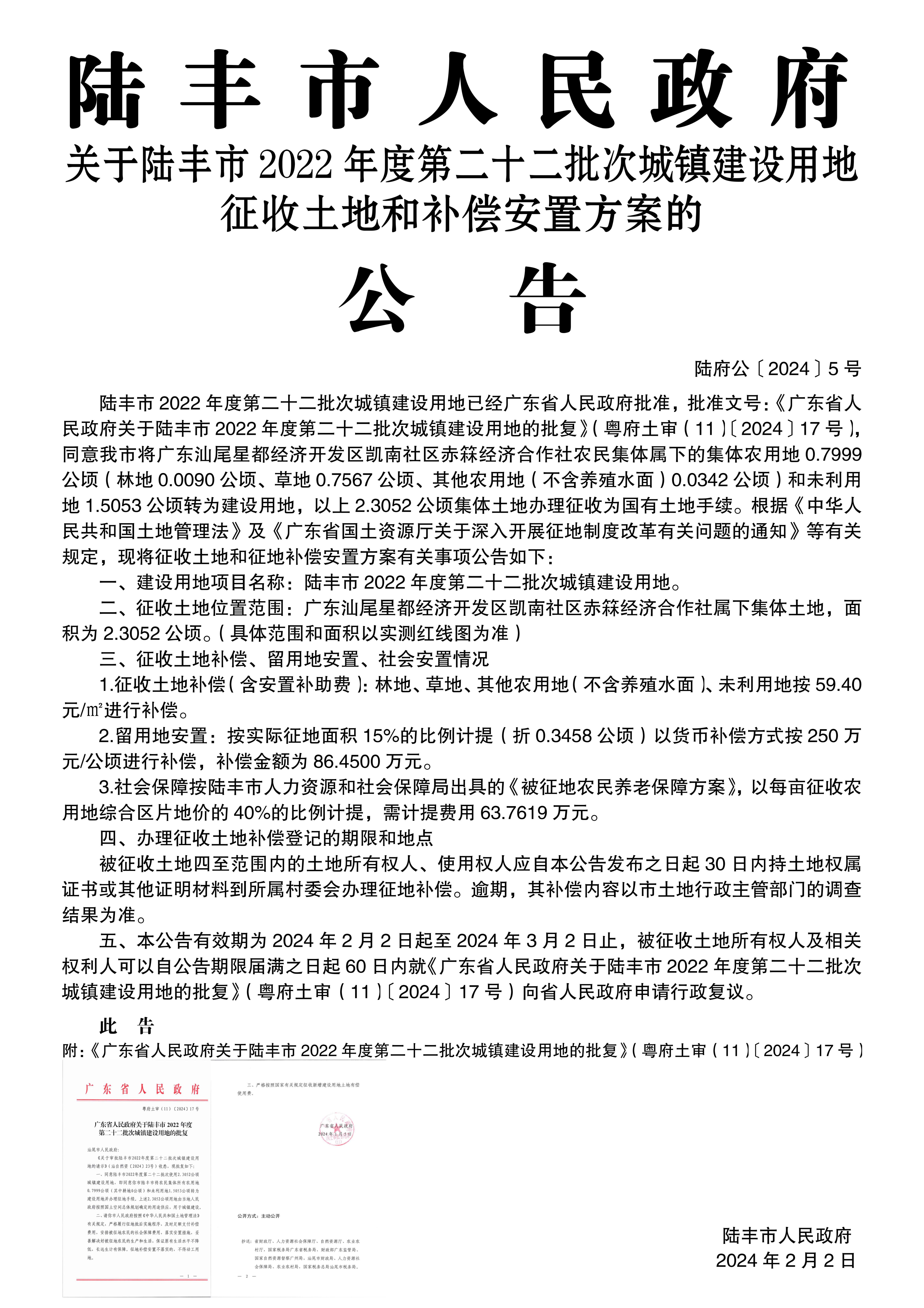 廣東省人民政府關(guān)于陸豐市2022年度第二十二批次城鎮(zhèn)建設(shè)用地的批復(fù)(粵府土審(11)〔2024〕17號(hào))