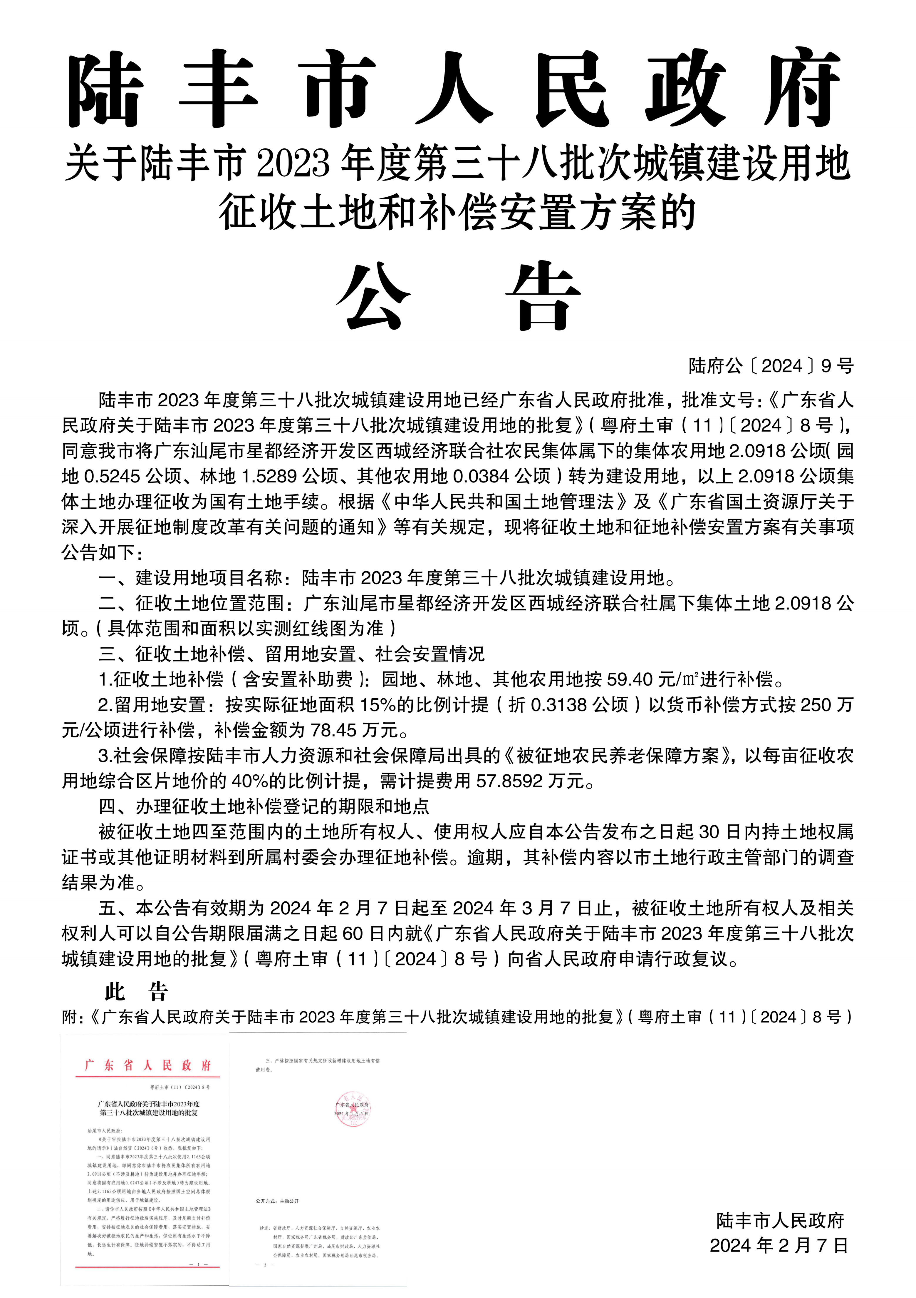 廣東省人民政府關(guān)于陸豐市 2023年度第三十八批次城鎮(zhèn)建設(shè)用地的批復(fù)(粵府土審(11)〔2024〕8號)