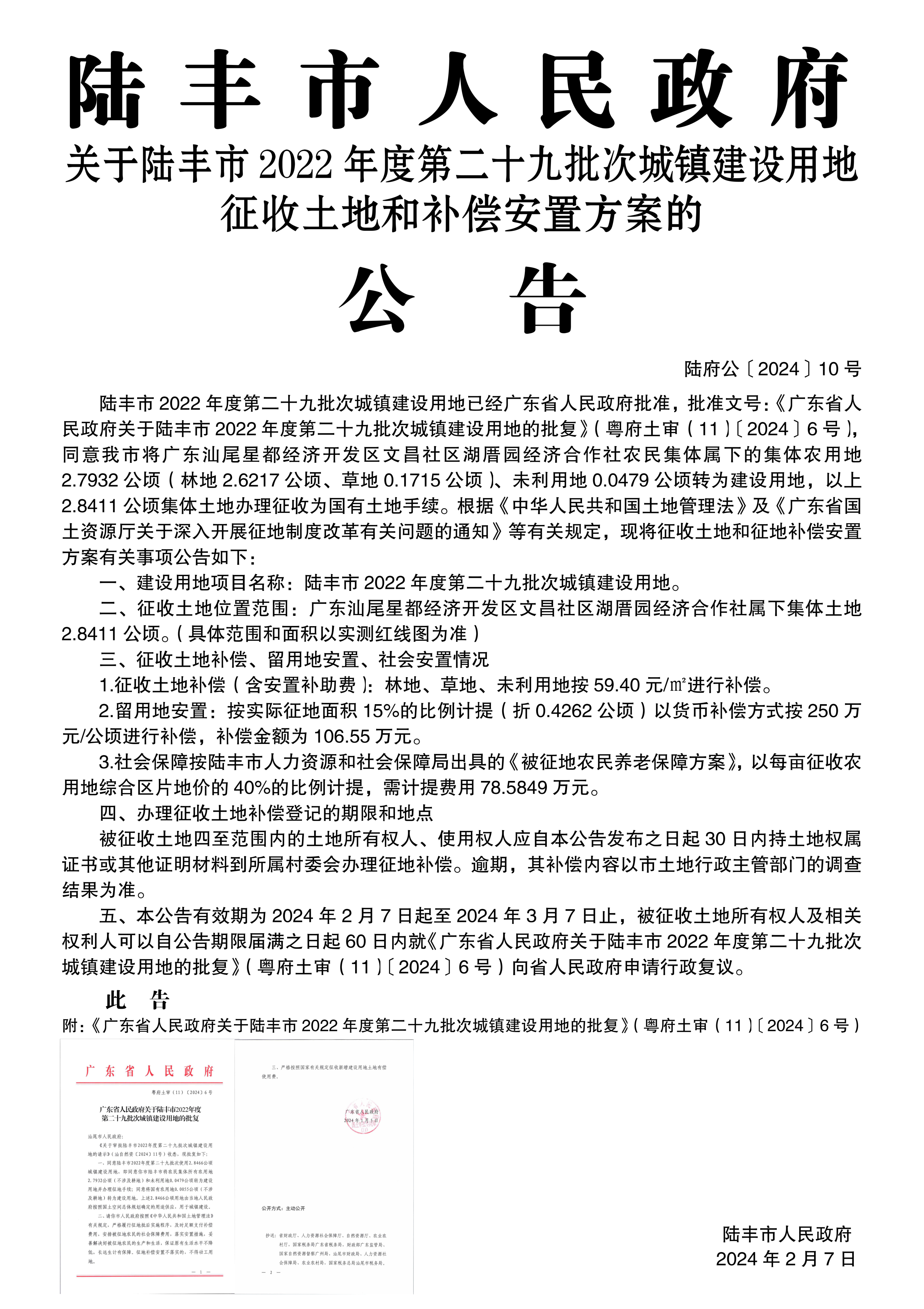 廣東省人民政府關(guān)于陸豐市 2022年度第二十九批次城鎮(zhèn)建設(shè)用地的批復(fù)(粵府土審(11)〔2024〕6號)