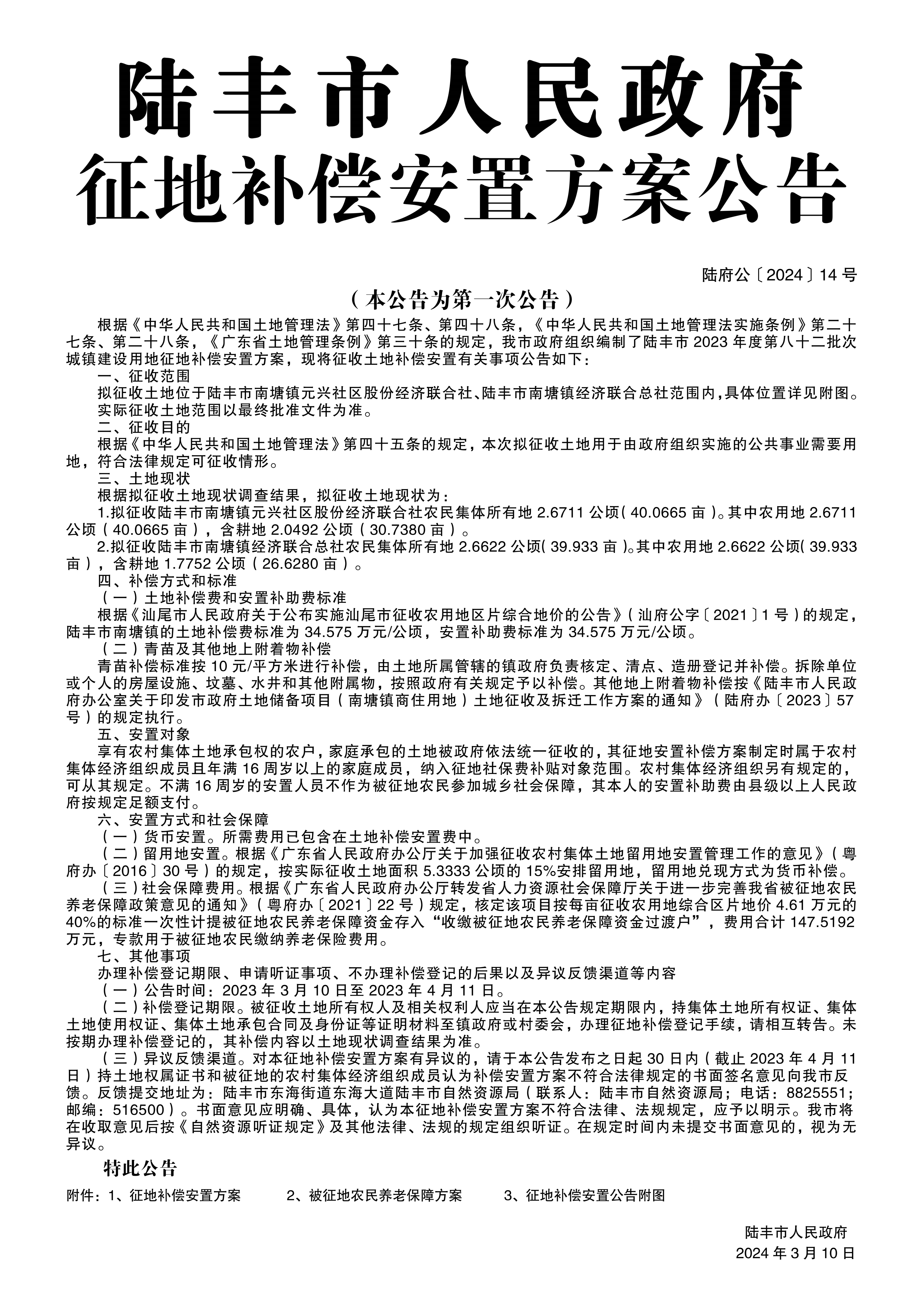陸豐市人民政府征收土地和補(bǔ)償安置方案公告(陸府公〔2024〕14號(hào))