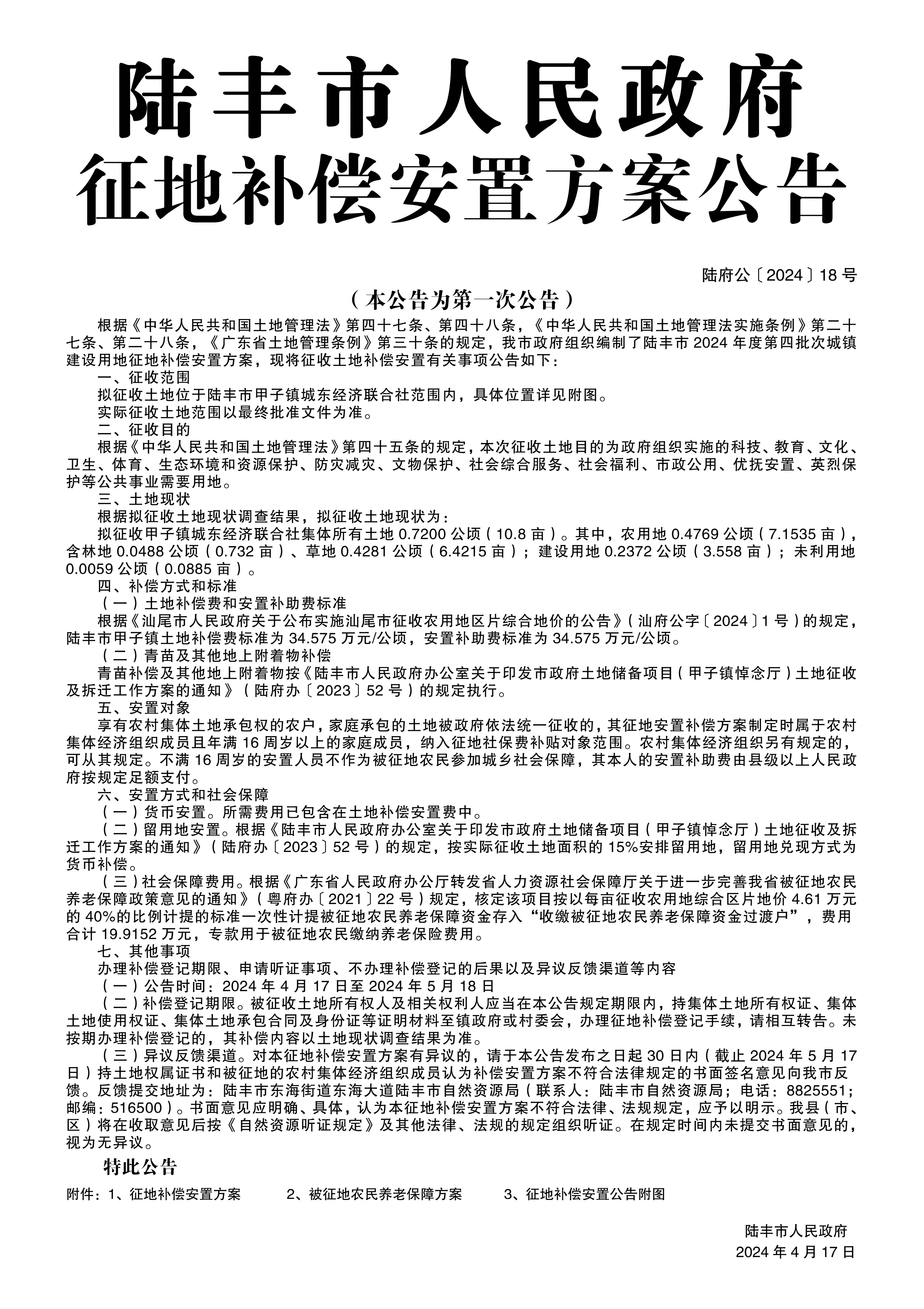 陸豐市人民政府關于征收土地補償安置方案的公告(陸府公〔2024〕18號)