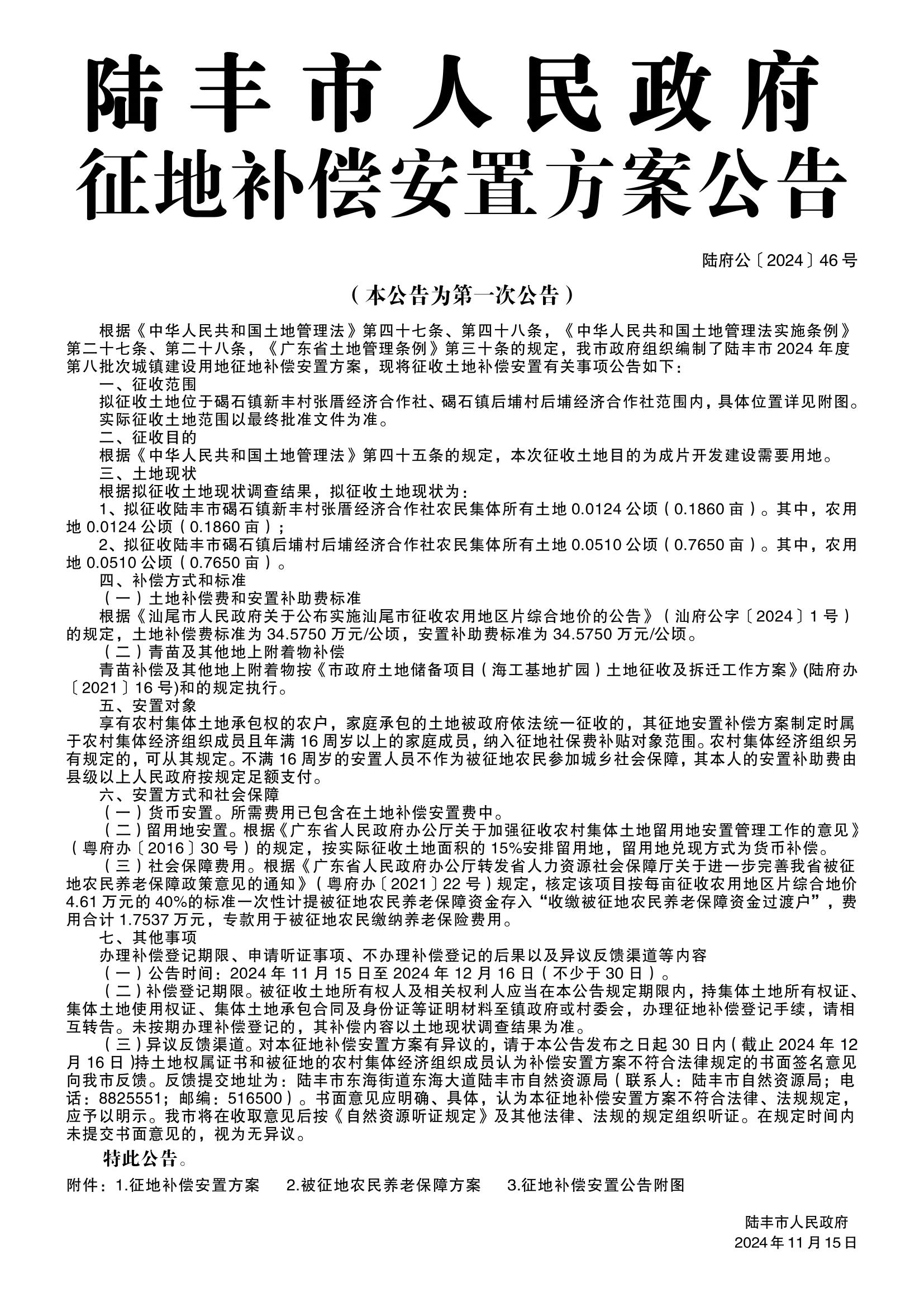 陸豐市人民政府征收土地和補(bǔ)償安置方案公告(陸府公〔2024〕46號)