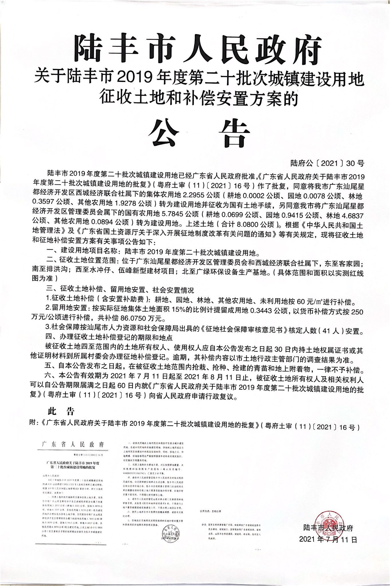 廣東省人民政府關(guān)于陸豐市 2019 年度第二十批次城鎮(zhèn)建設(shè)用地的批復(fù)(粵府土審(11)〔2021〕16號)