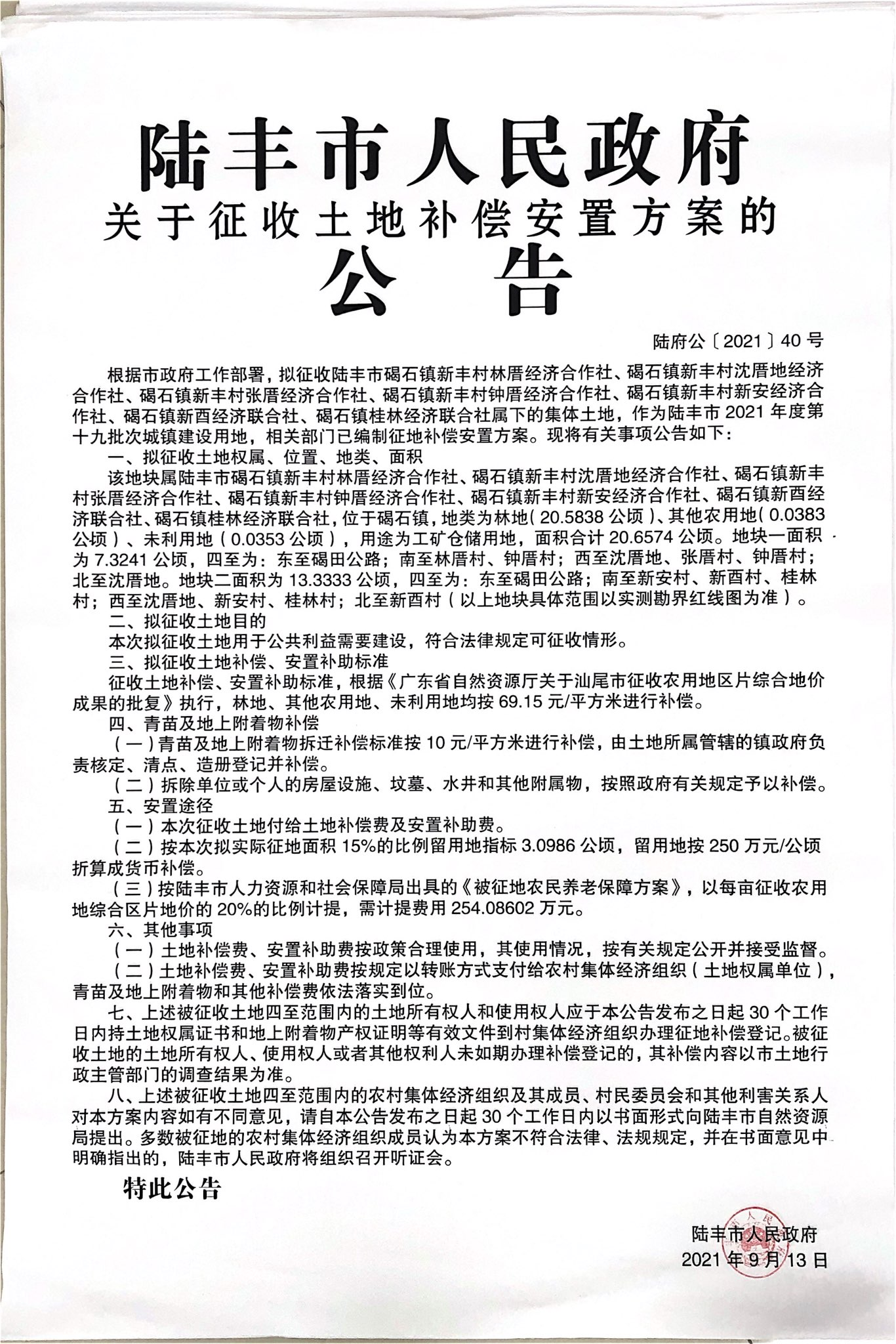 陸豐市人民政府關于征收土地補償安置方案的公告(陸府公[2021]40號)