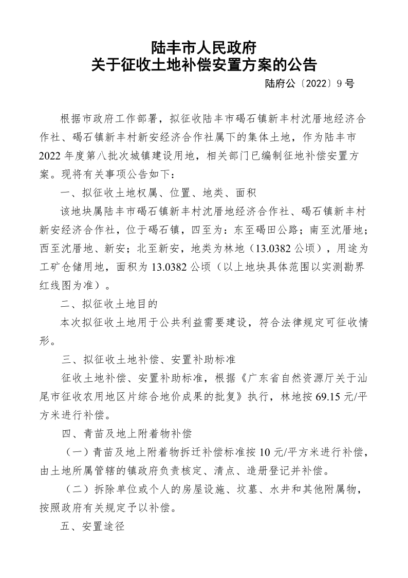 陸豐市人民政府關于征收土地補償安置方案的公告(陸府公〔2022〕9 號)