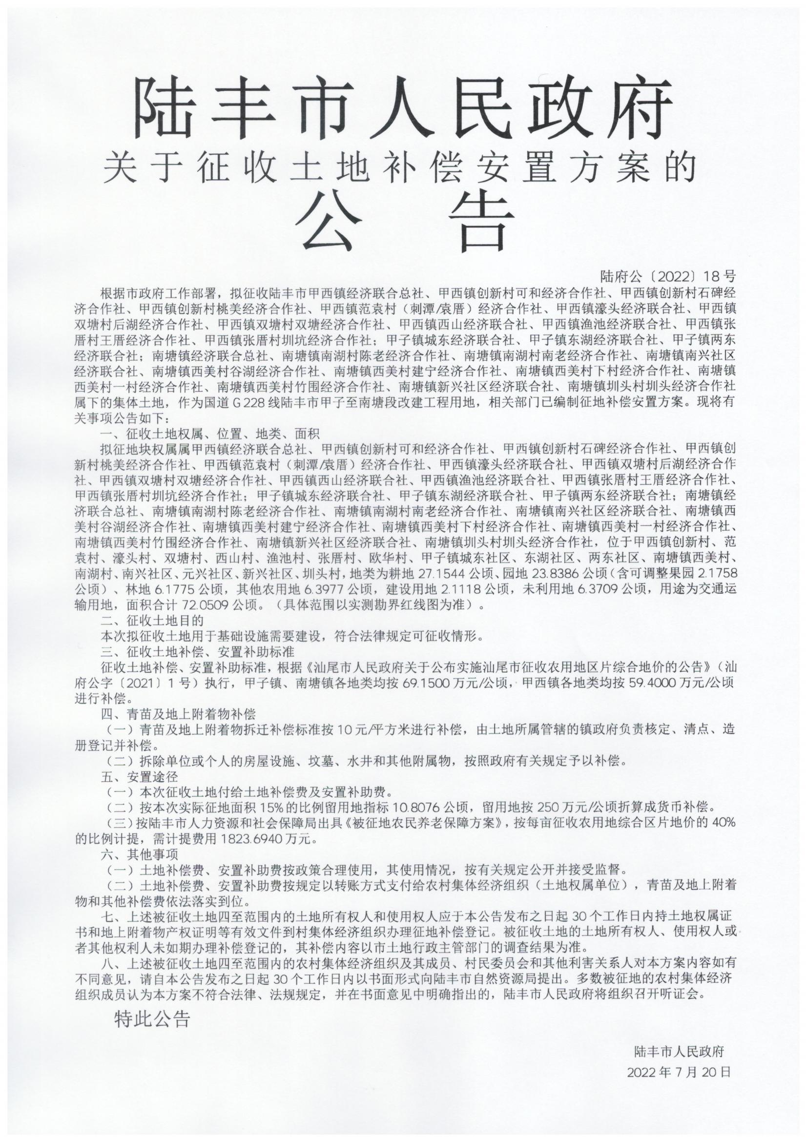 陸豐市人民政府關(guān)于征收土地補(bǔ)償安置方案公告(陸府公〔2022〕18號(hào))