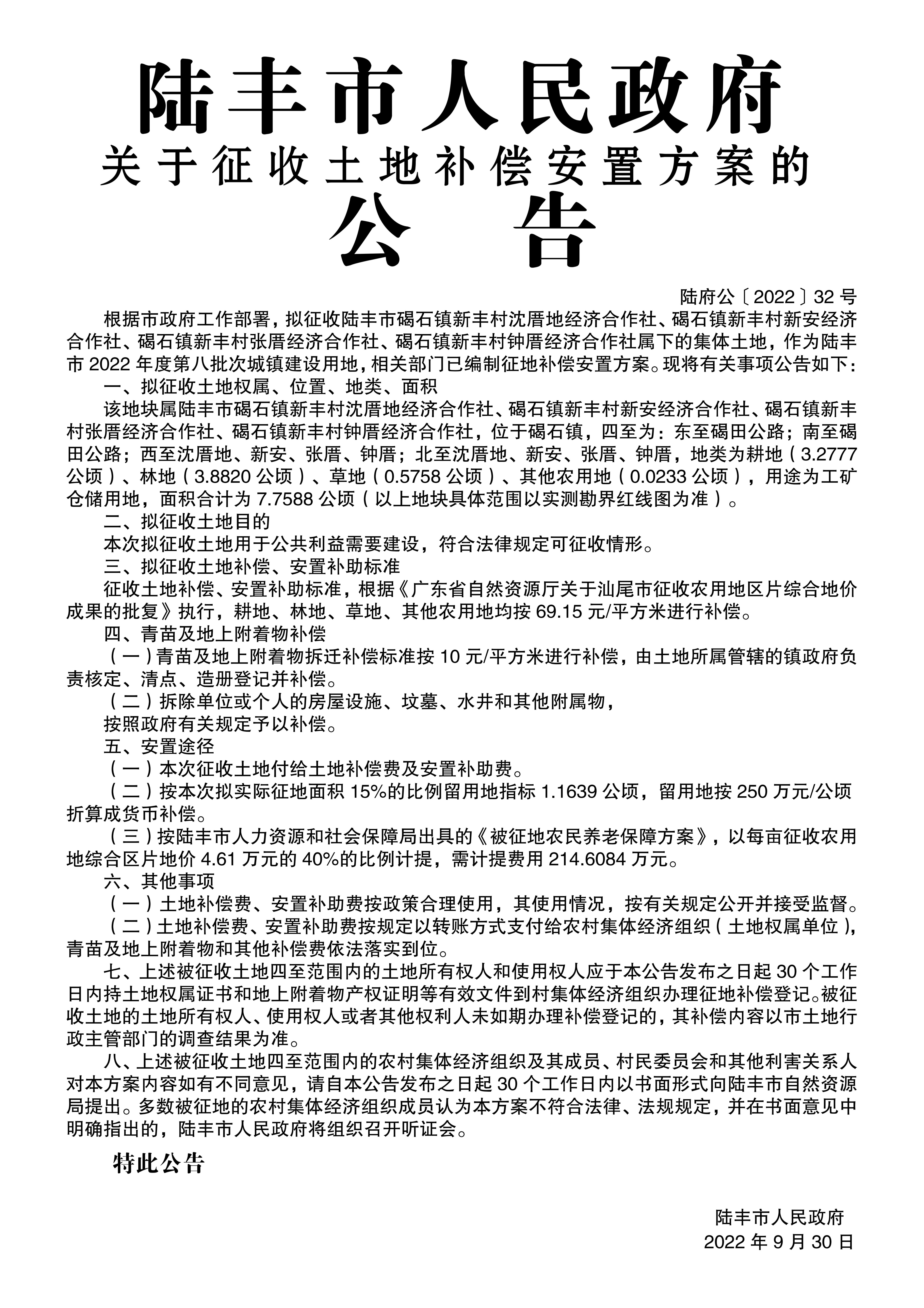 陸豐市人民政府關(guān)于征收土地和補(bǔ)償安置方案的公告(陸府公[2022]32號(hào))