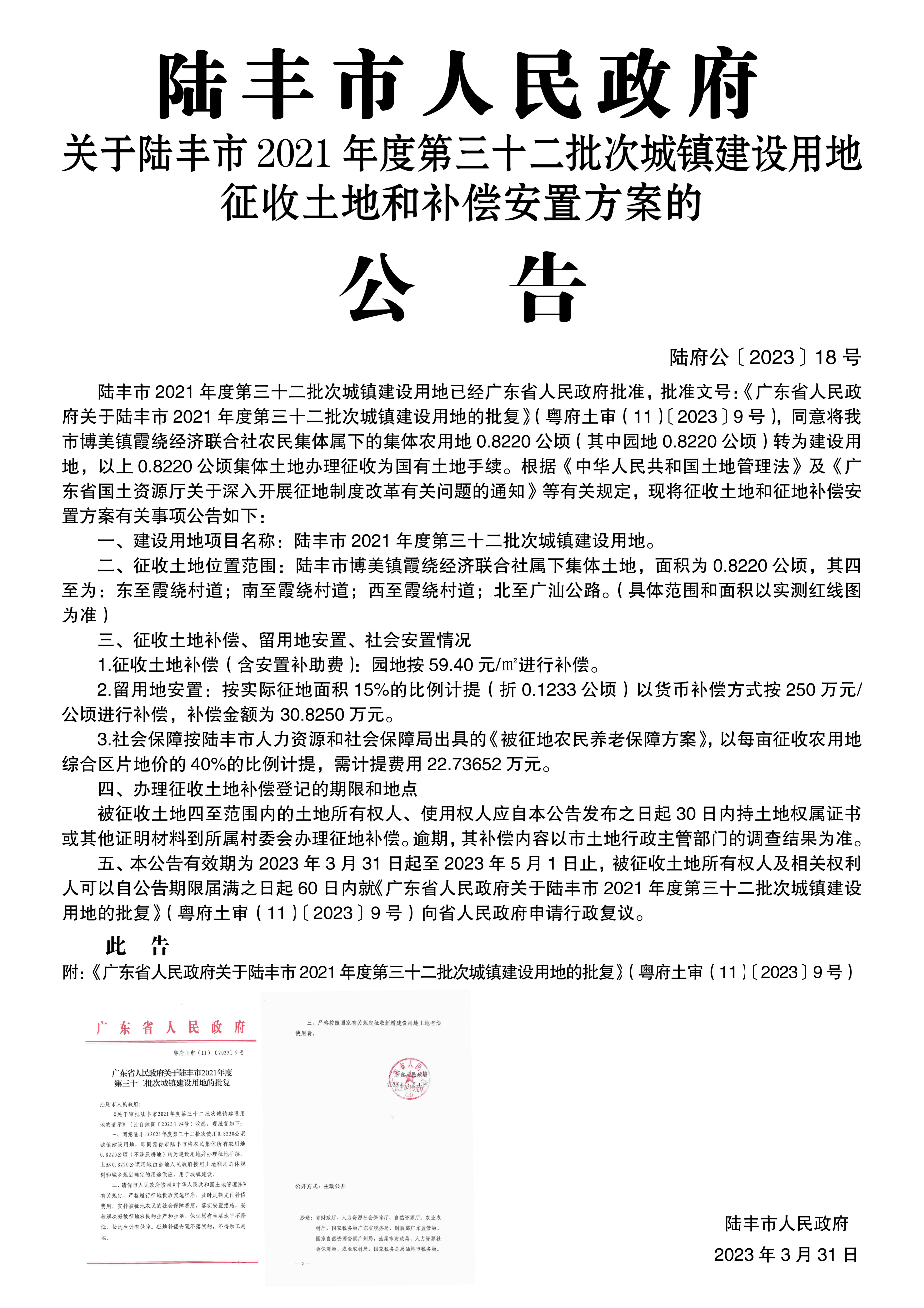 廣東省人民政府關(guān)于陸豐市 2021年度第三十二批次城鎮(zhèn)建設(shè)用地的批復(fù)(粵府土審(11)〔2023〕9號)