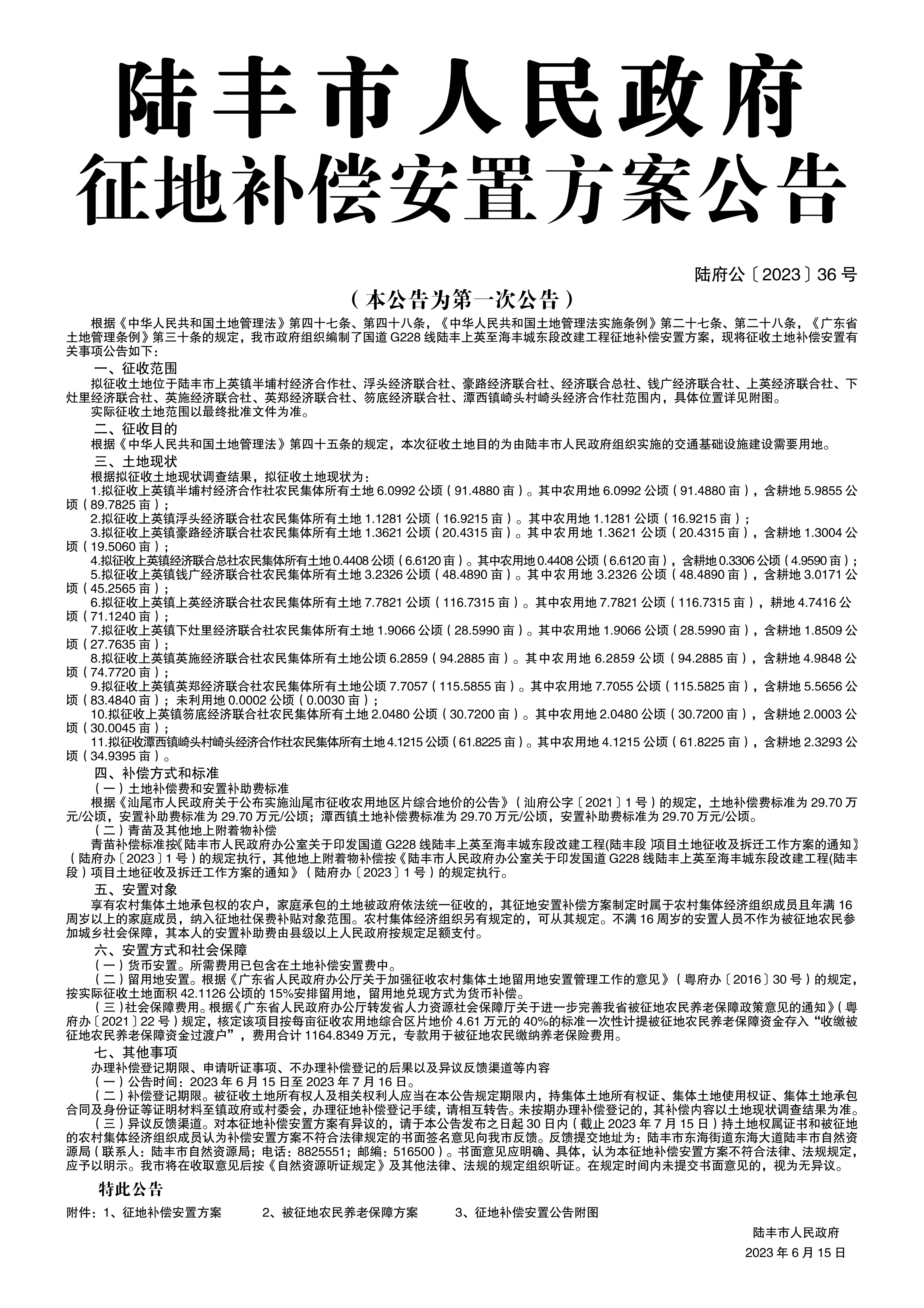 陸豐市人民政府關(guān)于征收土地補償安置方案的公告(陸府公〔2023〕36號)