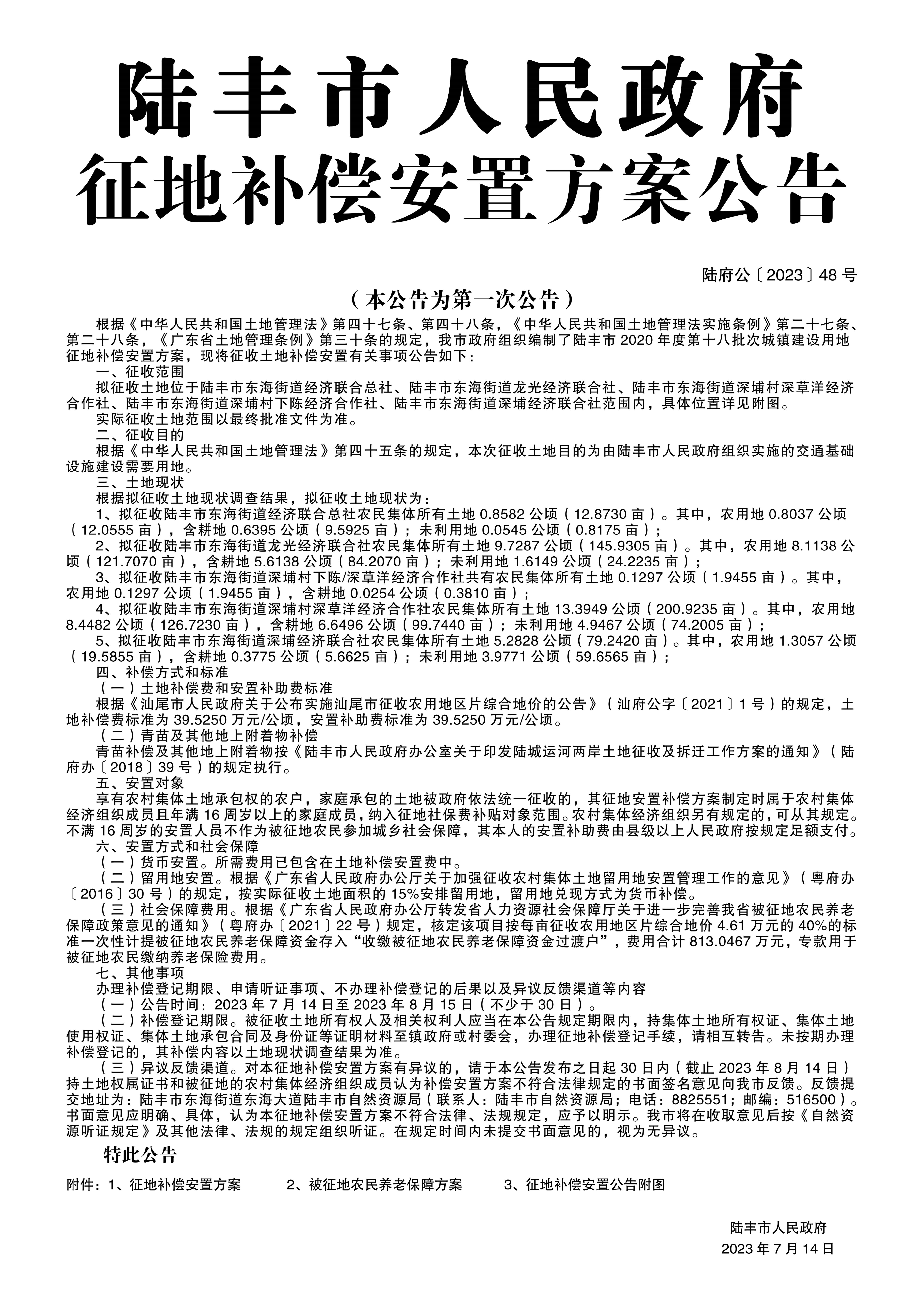 陸豐市人民政府關(guān)于征收土地補償安置方案的公告(陸府公〔2023〕48號)