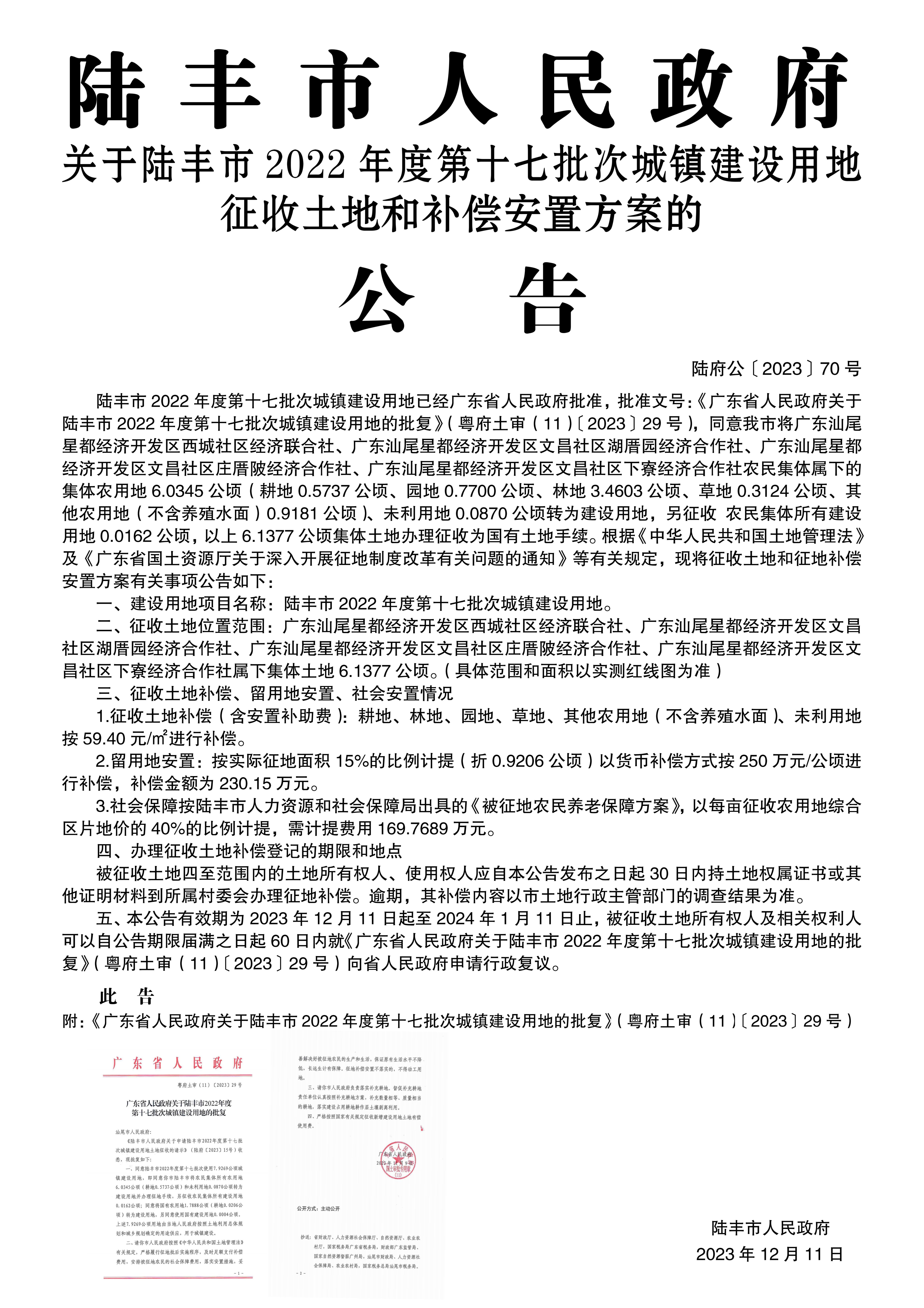 廣東省人民政府關(guān)于陸豐市 2022年度第十七批次城鎮(zhèn)建設(shè)用地的批復(fù)(粵府土審(11)〔2023〕29號(hào))