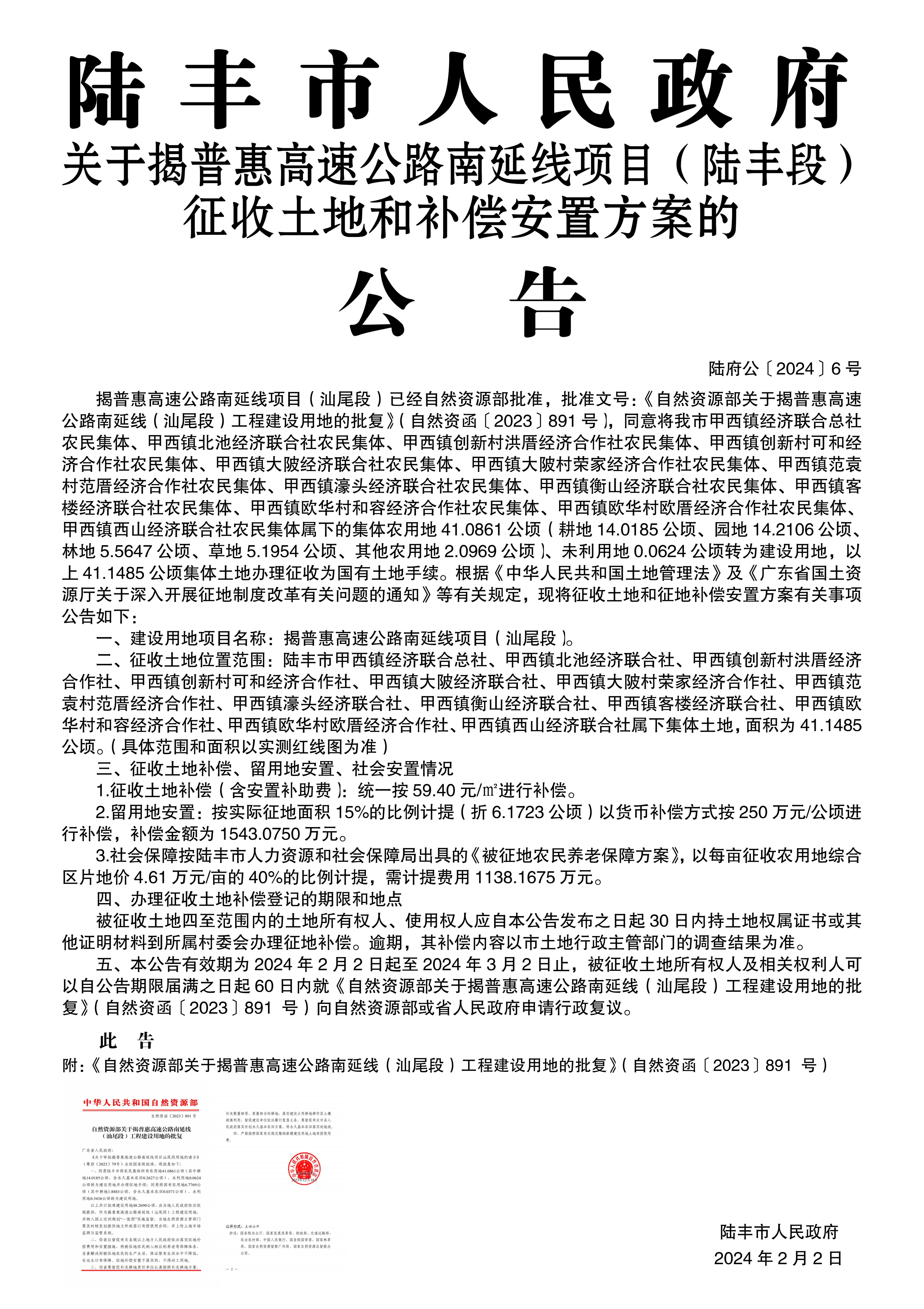 陸豐市人民政府關(guān)于揭普惠高速公路南延線項(xiàng)目(陸豐段)征收土地和補(bǔ)償安置方案的公告(陸府公〔2024〕6號(hào))