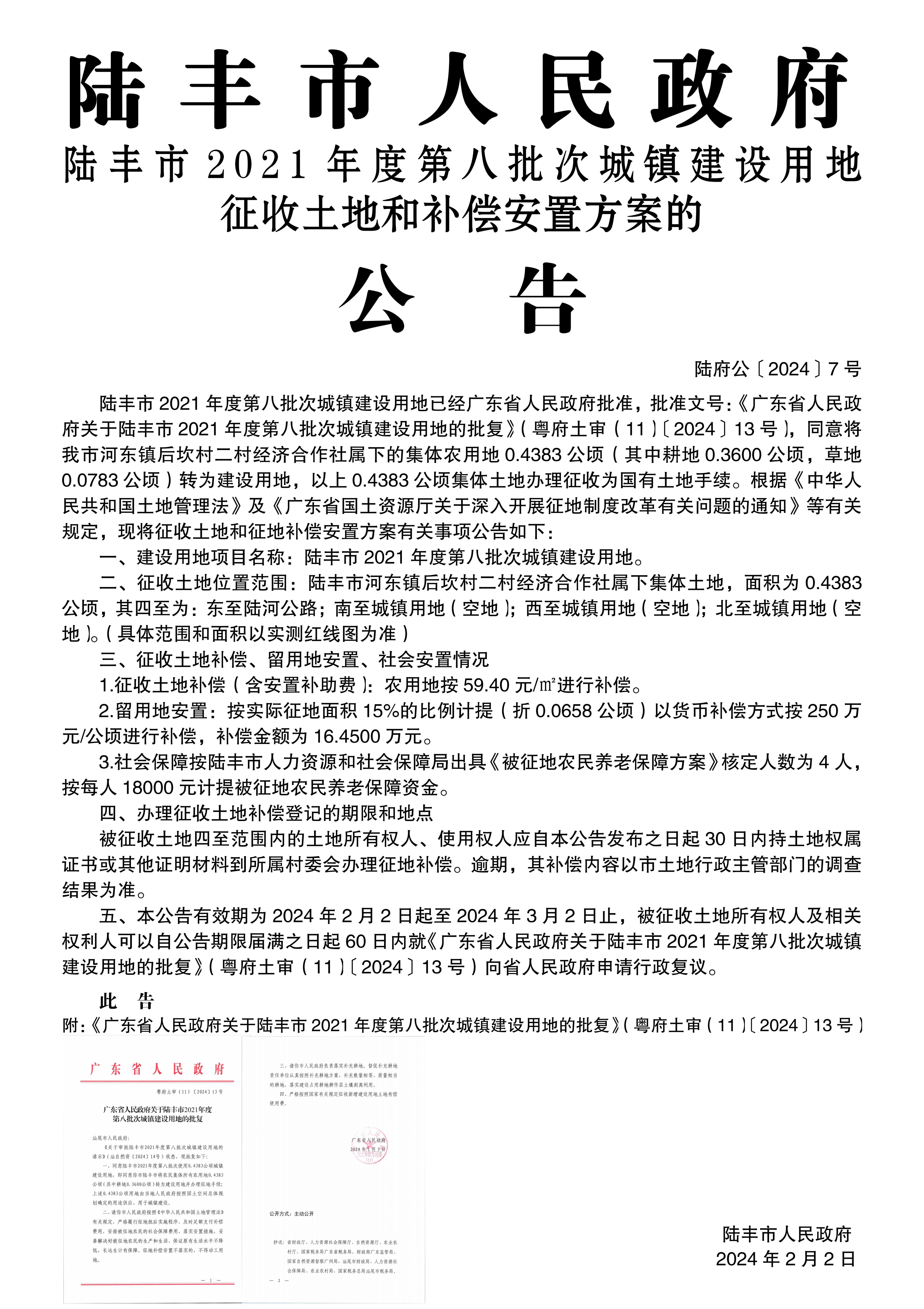 廣東省人民政府關(guān)于陸豐市 2021年度第八批次城鎮(zhèn)建設(shè)用地的批復(粵府土審(11)〔2024〕13號)