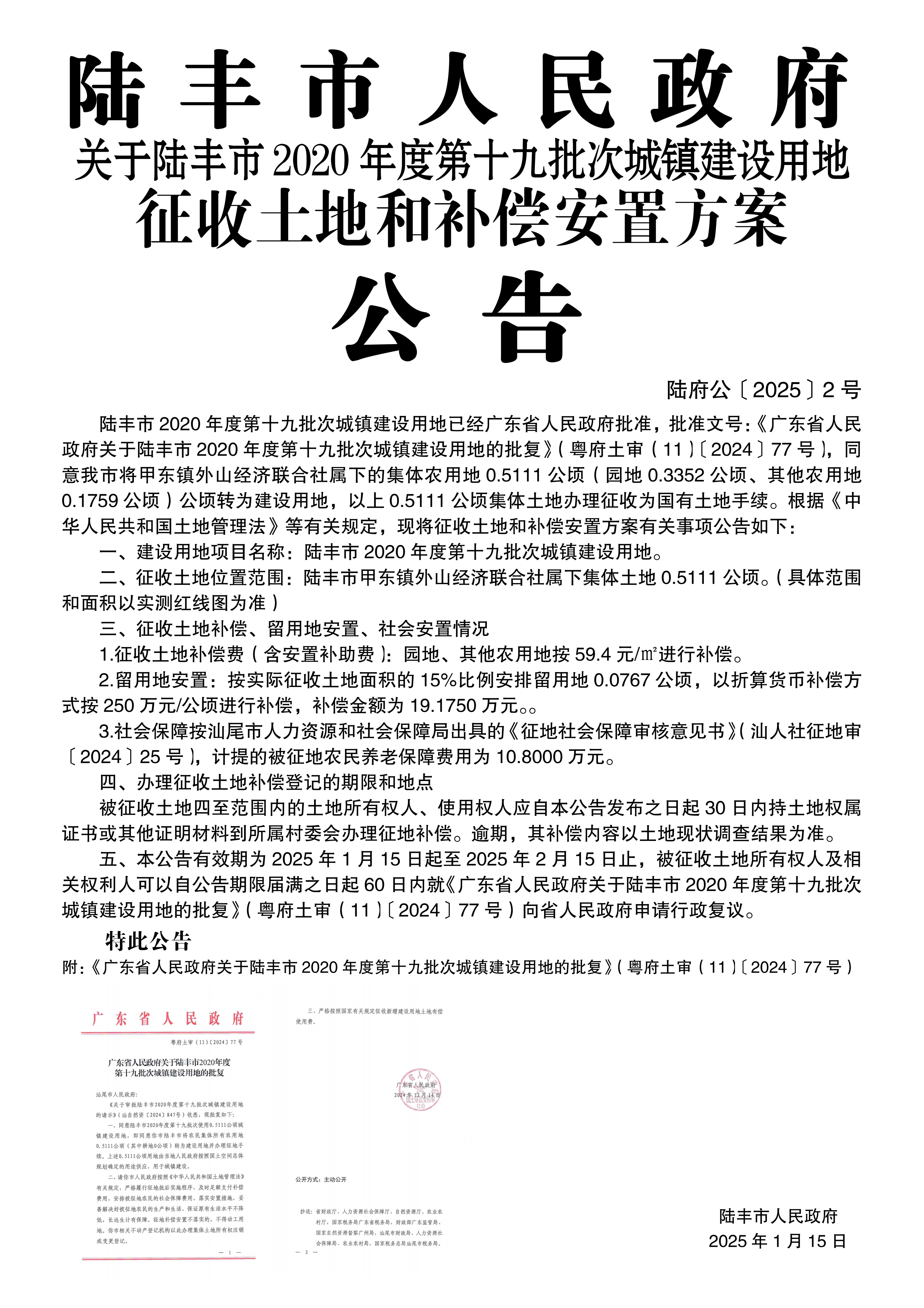 廣東省人民政府關(guān)于陸豐市 2020年度第十九批次城鎮(zhèn)建設(shè)用地的批復(fù)(粵府土審(11)〔2024〕77號(hào))
