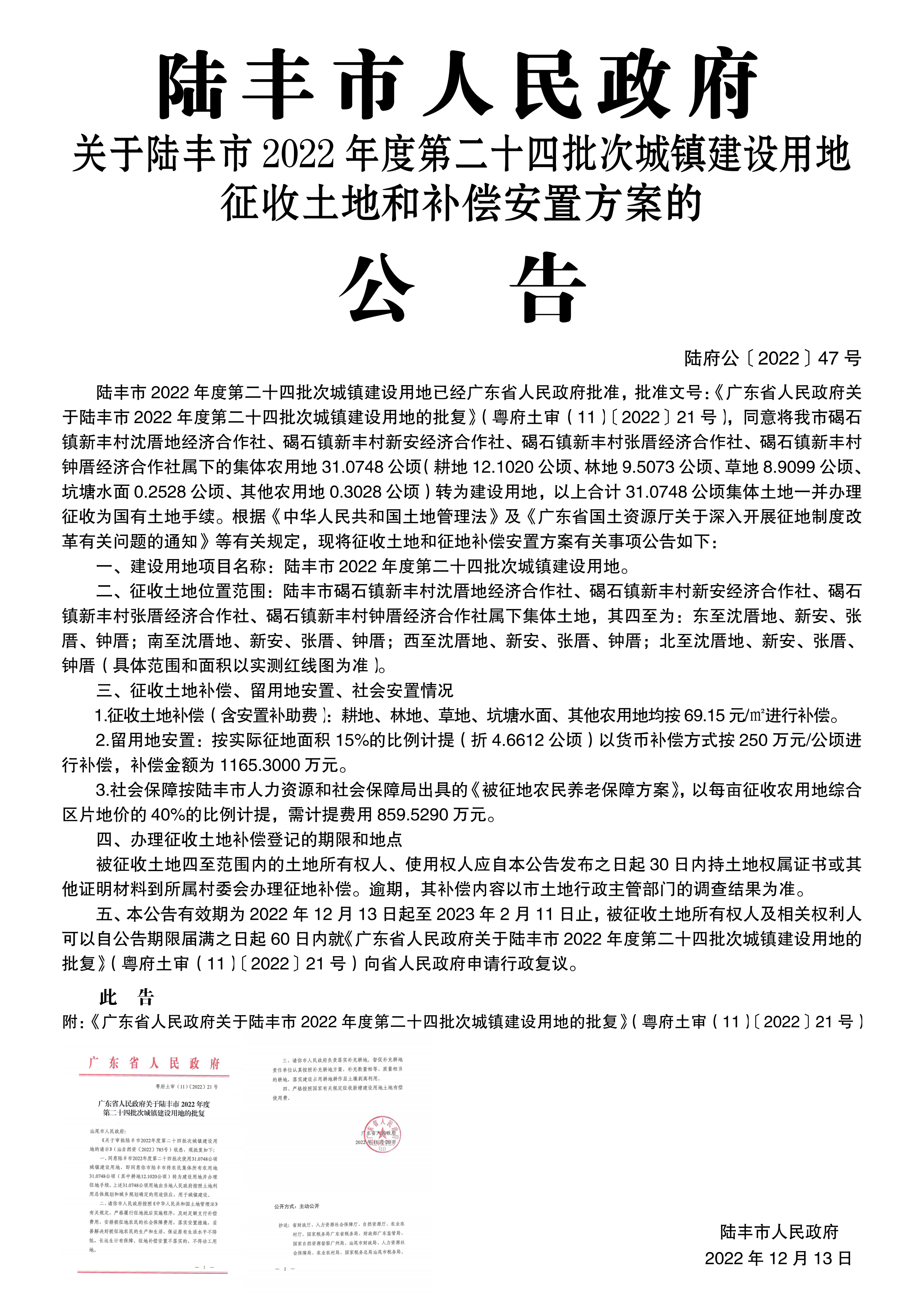 廣東省人民政府關(guān)于陸豐市 2022年度第二十四批次城鎮(zhèn)建設(shè)用地的批復(fù)(粵府土審(11)〔2022〕21號(hào))