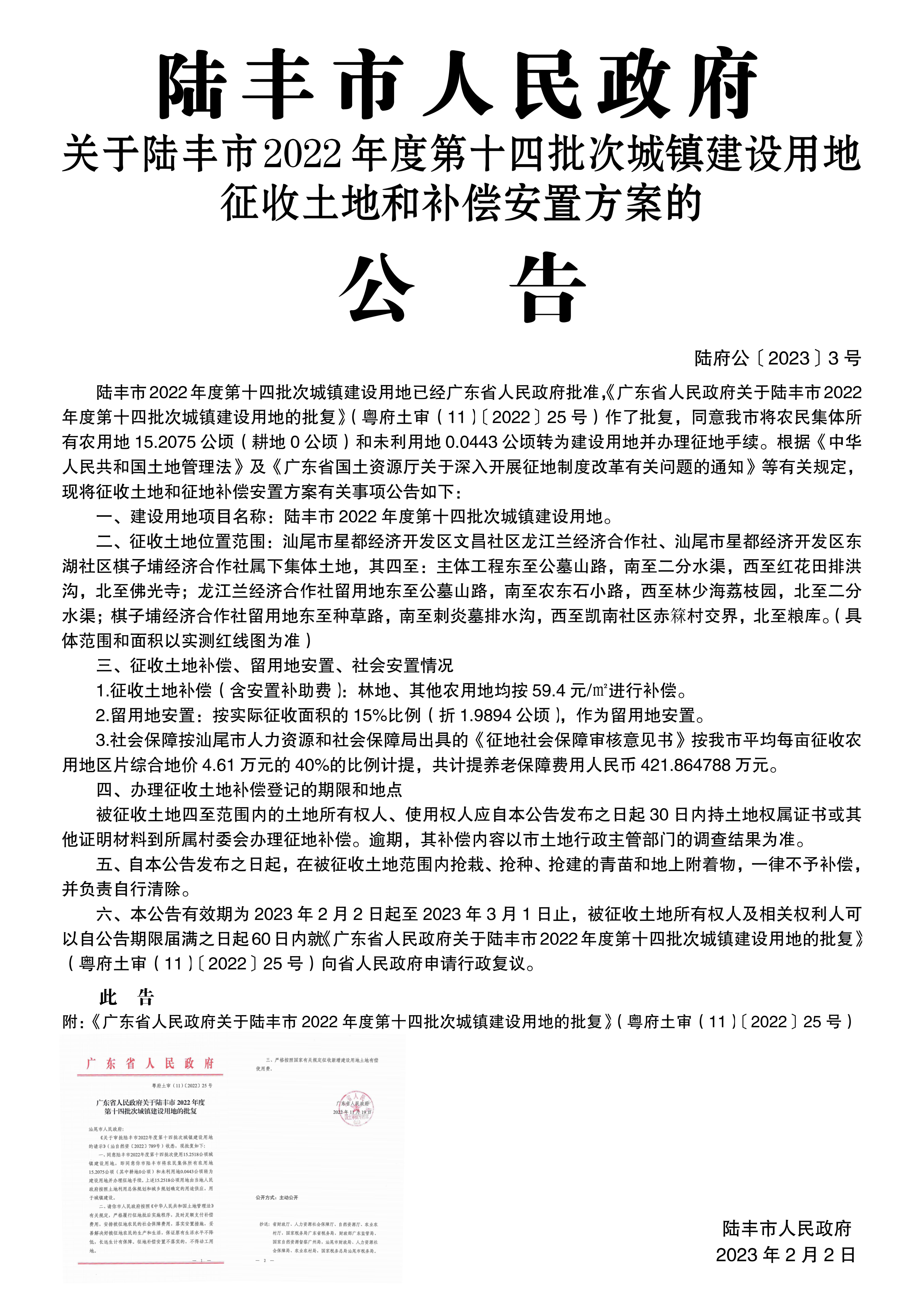 廣東省人民政府關于陸豐市 2022年度第十四批次城鎮(zhèn)建設用地的批復(粵府土審(11)〔2022〕25號)