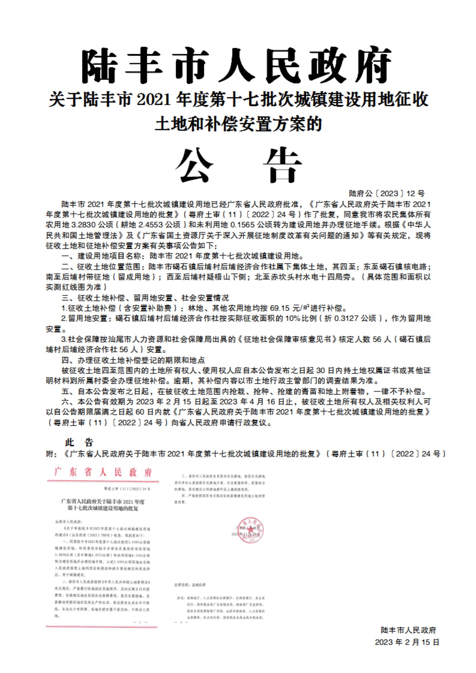 廣東省人民政府關(guān)于陸豐市2021年度第十七批次城鎮(zhèn)建設(shè)用地的批復(fù)(粵府土審(11)〔2022〕24號)